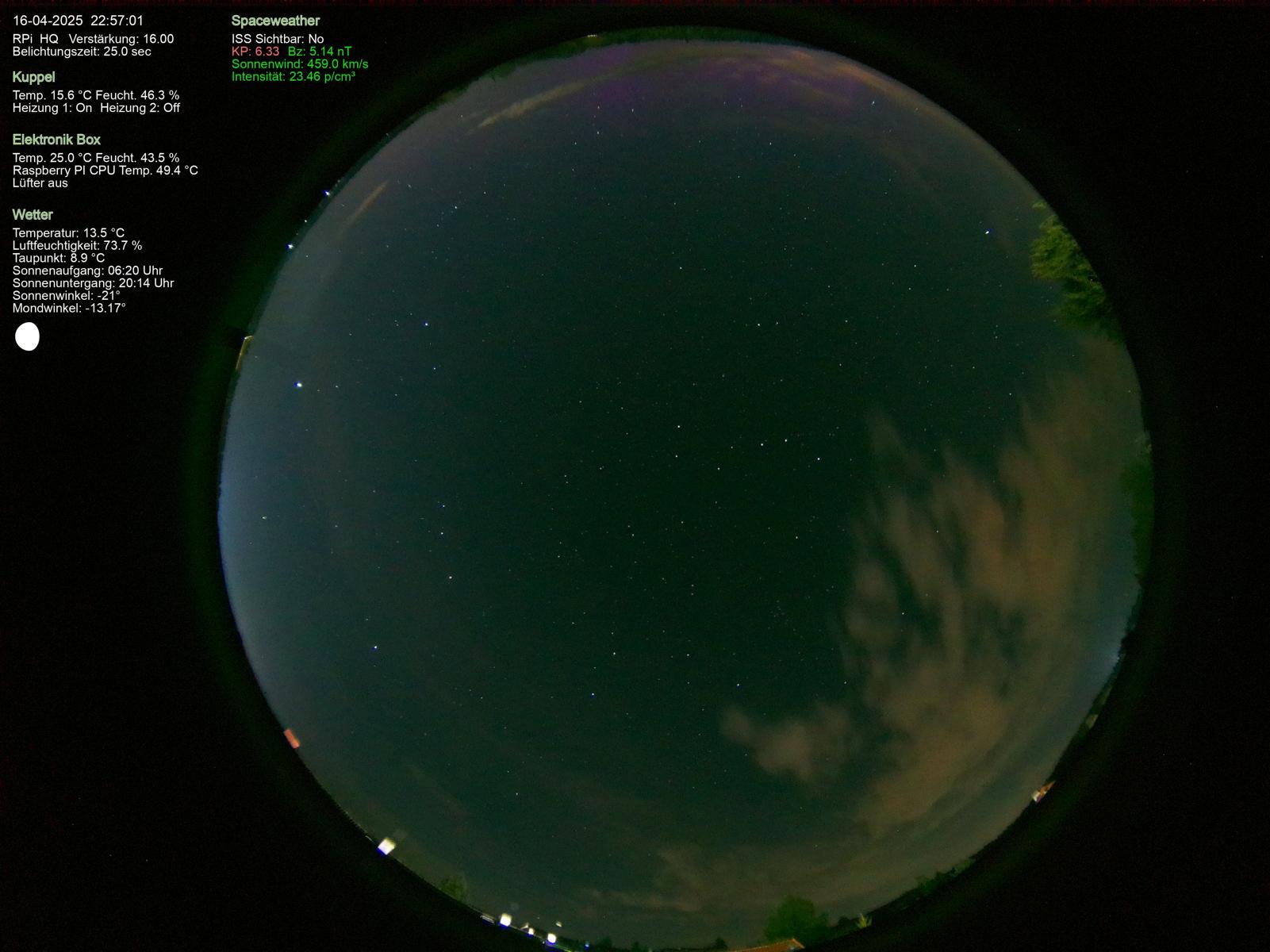 bei mir in Hamburg-Rahlstedt waren die Bedingungen mieß. Tiefe Wolken im Norden und viele Schleierwolken. Trotzdem konnte ich bei dem Substorm um 22:55 MESZ (20:55 UTC) Polarlichtstrahlen fotografieren. Aufnahmen mit Canon R6II, 24 mm@f/2,5, Didymfilter, ISO 6400, t=1s.
