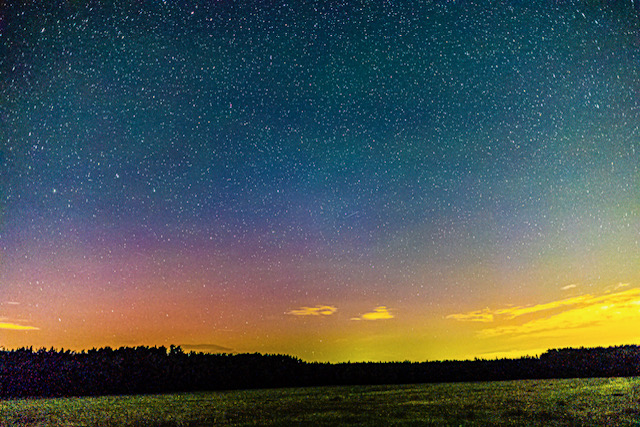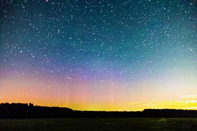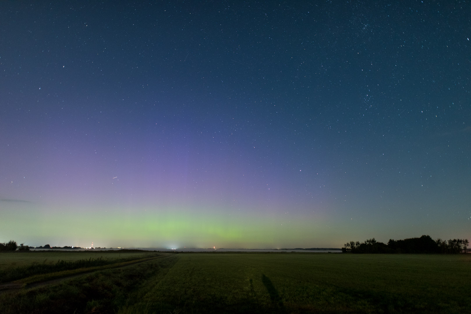 in Großenbrode, kurz vor der Fehmarnsundbrücke ist nun (22:15 Uhr MESZ) fotografisches PL zu sehen. Ein grüner Bogen am Horizont und darüber ein rotvioletter Bereich. Die Kamera läuft im Intervallmodus, ein Bild wird nachgeliefert.