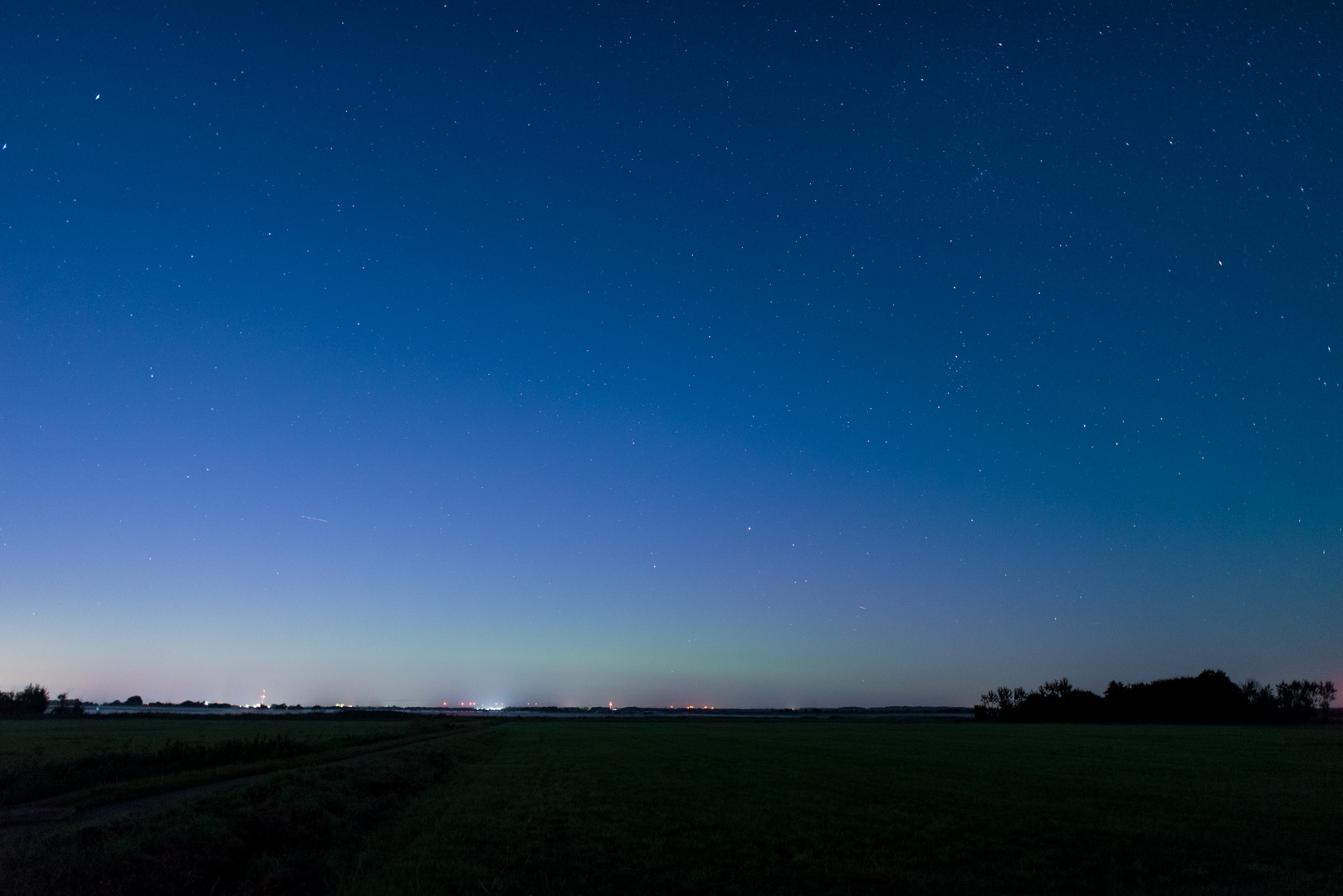 Gegen Ende der nautischen Dämmerung lief ich durch das angrenzende Torfmoor und wurde vom Mond geblendet, während sich am Boden kalte und bemerkenswert warme Luftbereiche abwechselten. Visuelles Polarlicht war mit Einbruch der Nacht zunächst nicht auszumachen, weshalb ich weiterlief und mir einen Standort mit guter Horizontsicht suchte. Ein erstes Probefoto gen Norden ließ zwar einen Polarlicht-Verdacht aufkommen, aber nicht viel mehr.