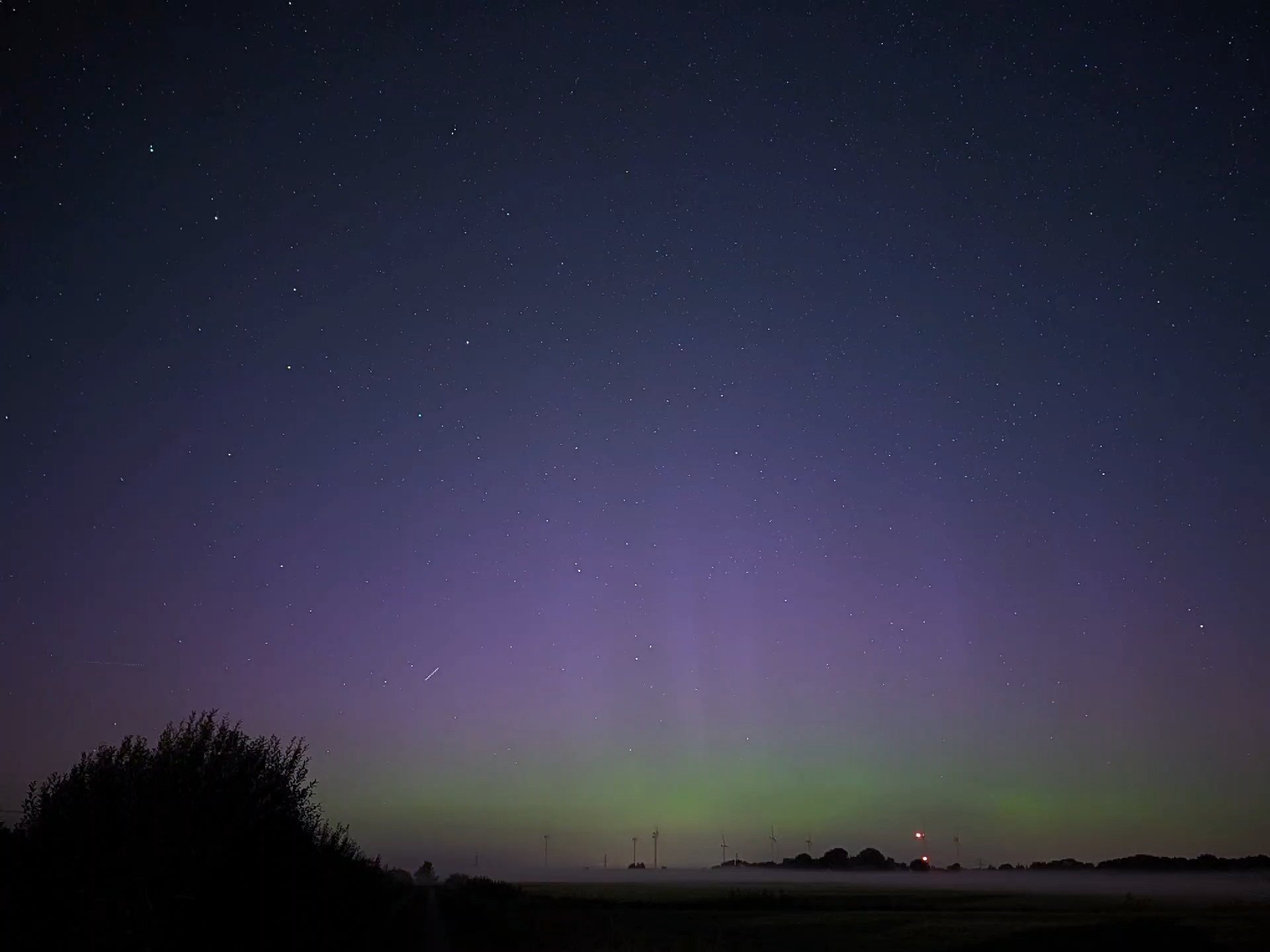 in Großenbrode, kurz vor der Fehmarnsundbrücke ist nun (22:15 Uhr MESZ) fotografisches PL zu sehen. Ein grüner Bogen am Horizont und darüber ein rotvioletter Bereich. Die Kamera läuft im Intervallmodus, ein Bild wird nachgeliefert.