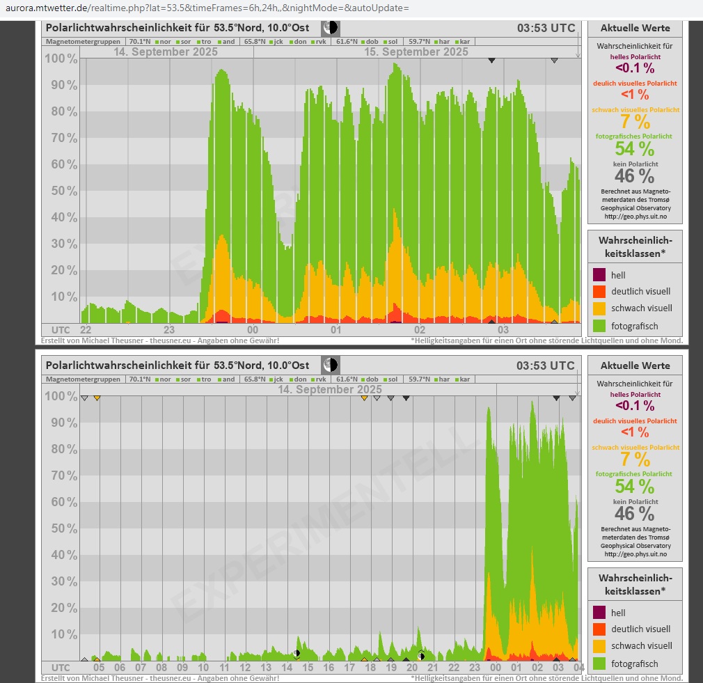 Hallo, ich war mal wieder länger am PC und hab mal einen Blick auf die Polarlichtmöglichkeit geschaut und war total erstaunt, danach müssten voll Polarlichter zu sehen gewesen sein, stundenlang, hier die Screenshots