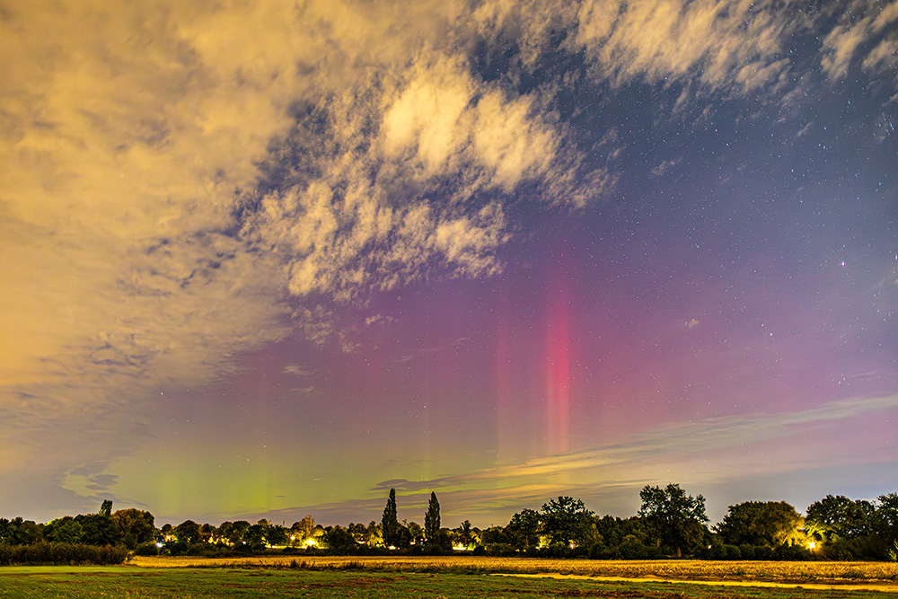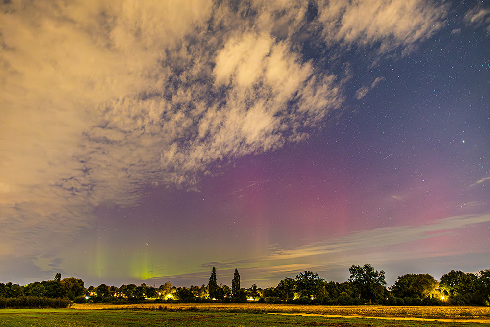anbei noch meine Beobachtung von der Nacht. Positioniert hatte ich mich auf einem Feldweg östlich von Rellingen, was nordwestlich von Hamburg liegt. Dort konnte ich bereits bei Ankunft gleich Polarlicht nachweisen: Kurz danach wurde der Rotanteil etwas mehr und der grüne Bogen deutlich visuell. Die Strahlen waren zeitweise schwach visuell zusehen. Danach nahm die Strahlenaktivität wieder ab, der grüne Bogen flackerte aber nochmals auf: Im Anschluss glimmte es nur noch und kurz nach 0 Uhr brach ich dann ab.