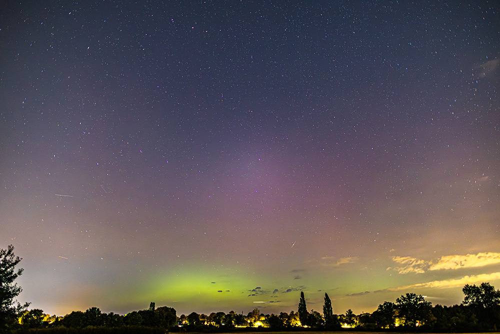 jetzt auch noch meine Beobachtung. Wie bereits in der Vornacht beobachtete ich von einem Feldweg östlich von Rellingen aus. Noch in der astronomischen Dämmerung konnte ich Polarlicht fotografisch nachweisen: Dann war erst einmal Pause, zumal auch das Mondlicht zunehmend störte. Erst gegen 20 UTC formierte sich langsam ein grüner Bogen: Kurz danach ging die Post ab und das Polarlicht wurde deutlich visuell. Man konnte sogar die Farbe (grün und rot) erahnen: Anschließend nahm die Aktivität nach und der grüne Bogen begann zu pulsieren, was wie RAGDA aussah (damit meine ich nicht, dass es RAGDA war, was wohl im Chat falsch verstanden wurde): Nachfolgend brach ich die Beobachtung ab. Den Substorm gegen 0:30 UTC habe ich nicht mehr mitbekommen.