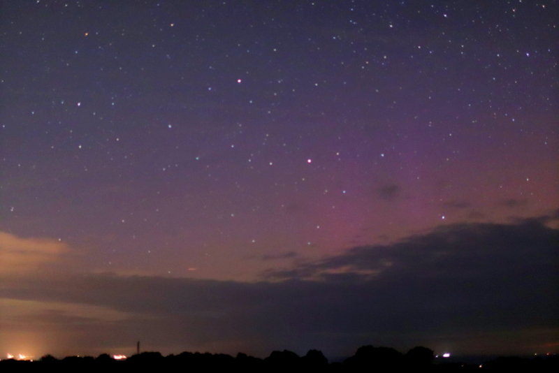 Kommentar: Hierzu stand ich nahe der Ortschaft Steinfeld und konnte bei wechselnder Bewölkung fotografische Aufnahmen machen. Das Polarlicht tauchte für wenige Minuten mit rötlichen Beamern auf.
