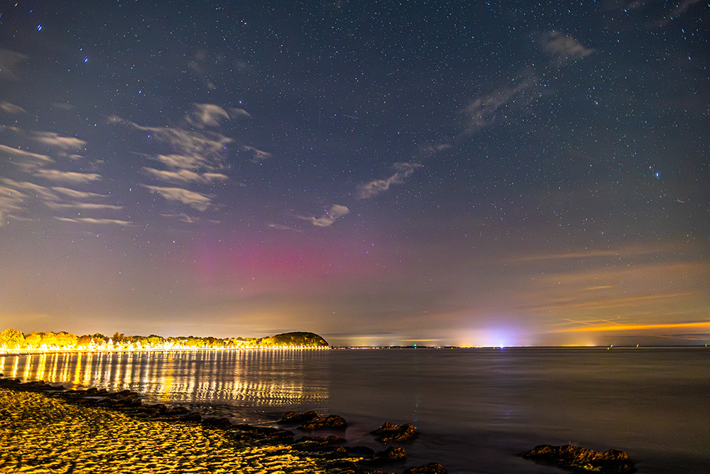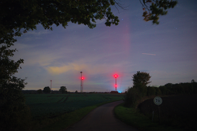 da das Wetter an dem Abend recht gut war dank Skandiföhn und auch die Speed ordentlich hoch war, Bz dazu teilweise negativ, hatte ich mich dieses Mal am Strand bei Travemünde positioniert. Einzelne Strahlen konnte ich zumindest phasenweise fotografisch nachweisen.