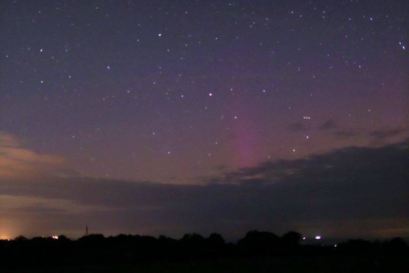Kommentar: Hierzu stand ich nahe der Ortschaft Steinfeld und konnte bei wechselnder Bewölkung fotografische Aufnahmen machen. Das Polarlicht tauchte für wenige Minuten mit rötlichen Beamern auf.