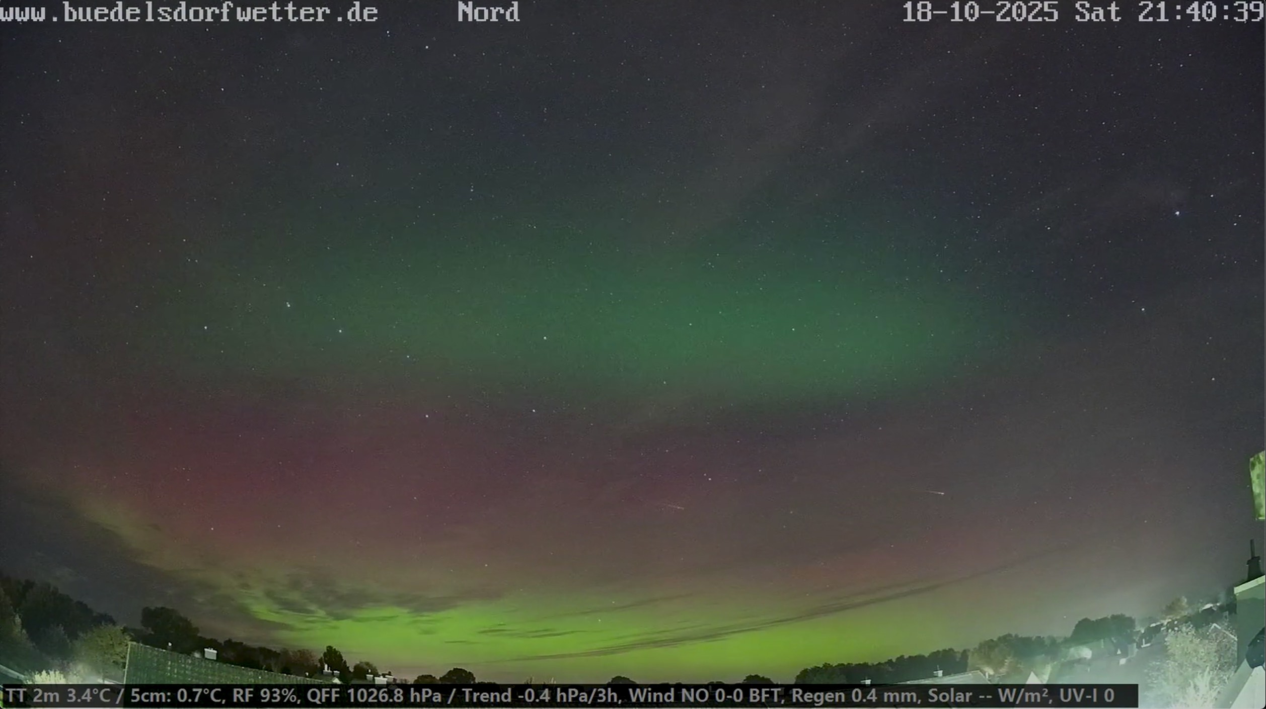 Die Webcam in Süderlügum (54° 52´19″ N/8° 54´45″ O) hat am 18. und 19.10.2025 wieder fotografisch Polarlicher aufzeichnen können.