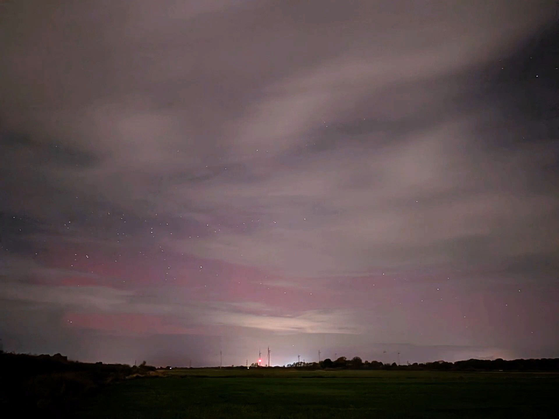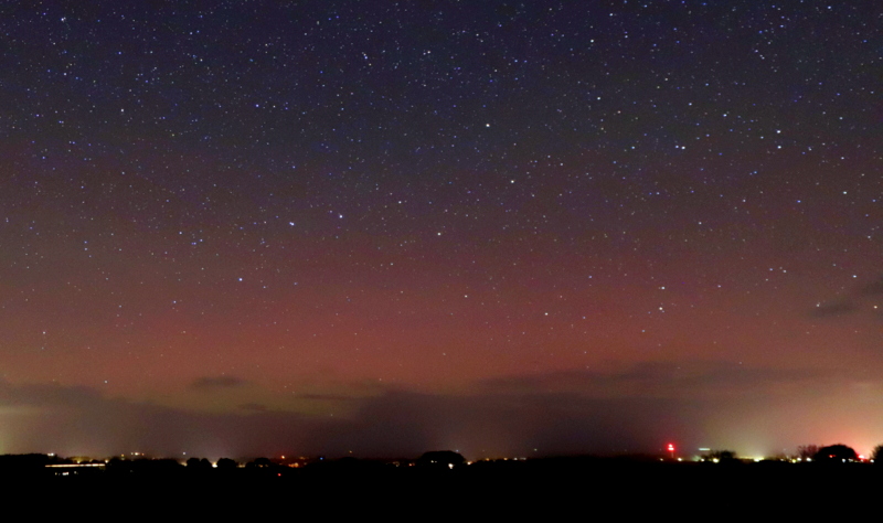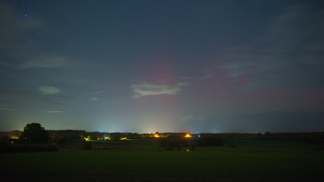 Meine WebCam in Büdelsdorf konnte ebenfalls fotografisches Polarlicht aufnehmen, leider auch viele Wolken dazwischen, aber dennoch nachweisbar: schwaches rotes Glimmen / rote Beamer.