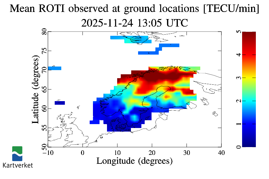 Gerade ist bereits die Ionosphäre in Nordeuropa stark gestört. ROTI aus Norwegen zeigt ein für die Nacht typisches Sturm-Display – das ist ungewöhnlich