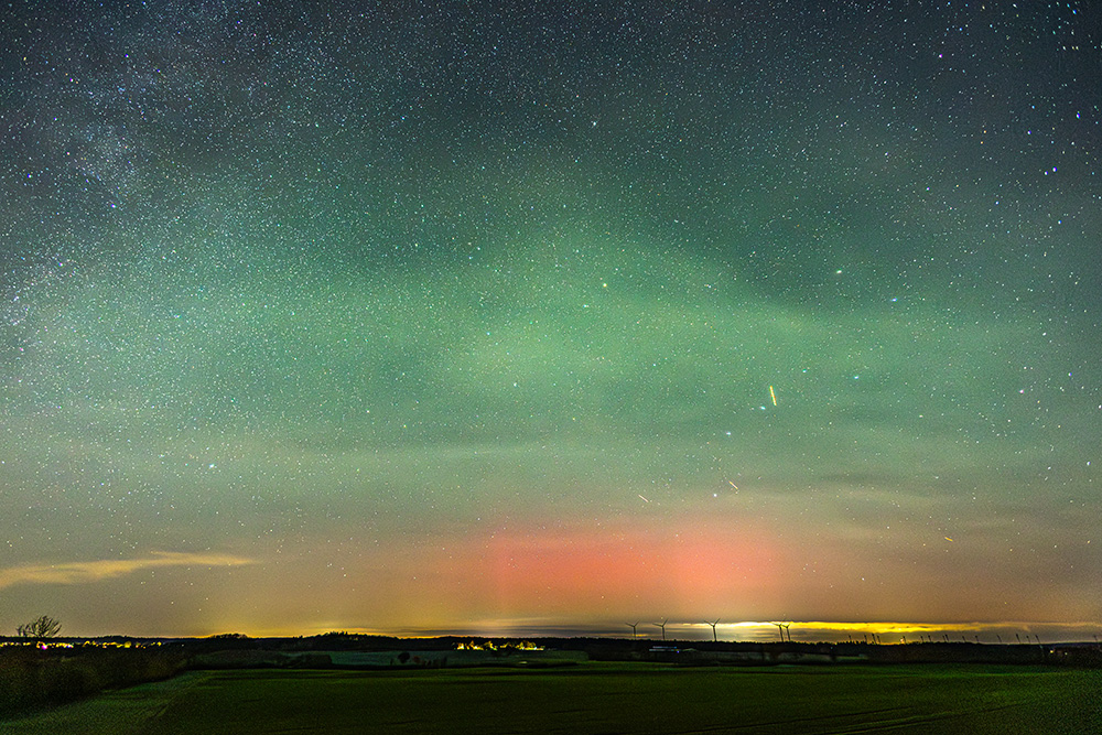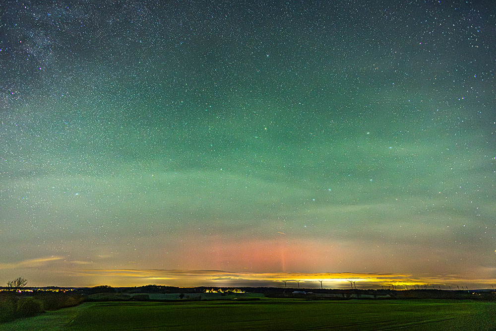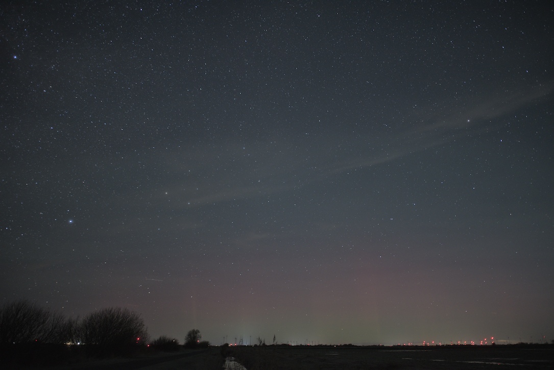 Das Polarlicht war auch schon von Beginn an als rötliches Glimmen vorhanden. Später gesellten sich dann Strahlen dazu. Das Polarlicht konnte ich im Gegensatz zum Airglow nicht visuell erkennen, sodass es "nur" ein fotografischer Nachweis war.