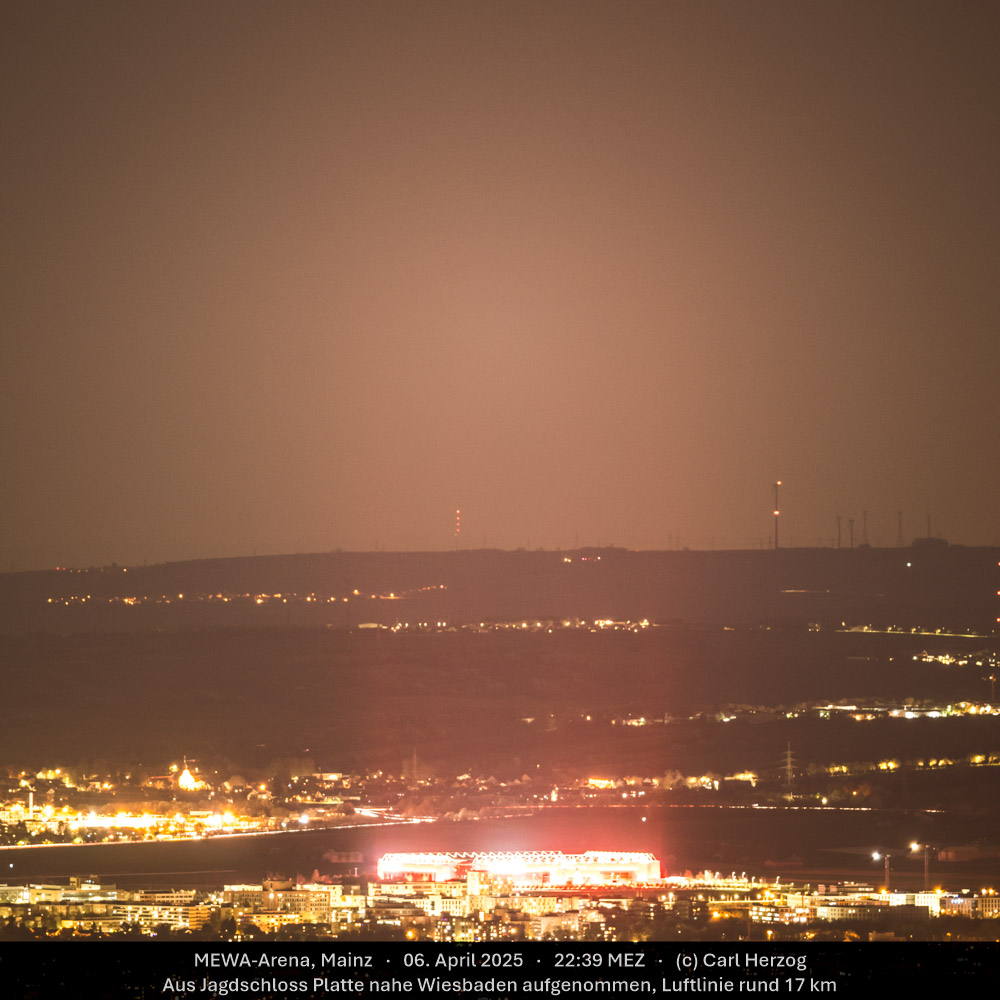 Die MEWA-Arena in Mainz habe ich seit geraumer Zeit auch im Visier, hier aus 17 km Entfernung fotografiert: