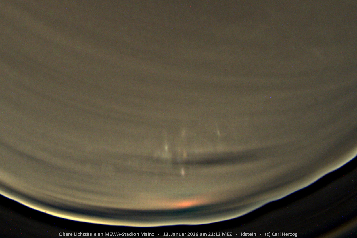 Nun auch ein Halo-Nachweis (obere Lichtsäulen) an den Stadionlichtern in Mainz aus 26 km Entfernung: