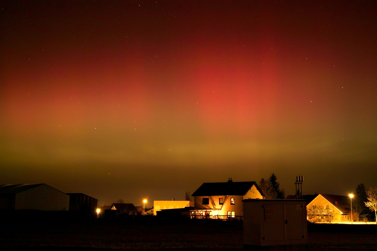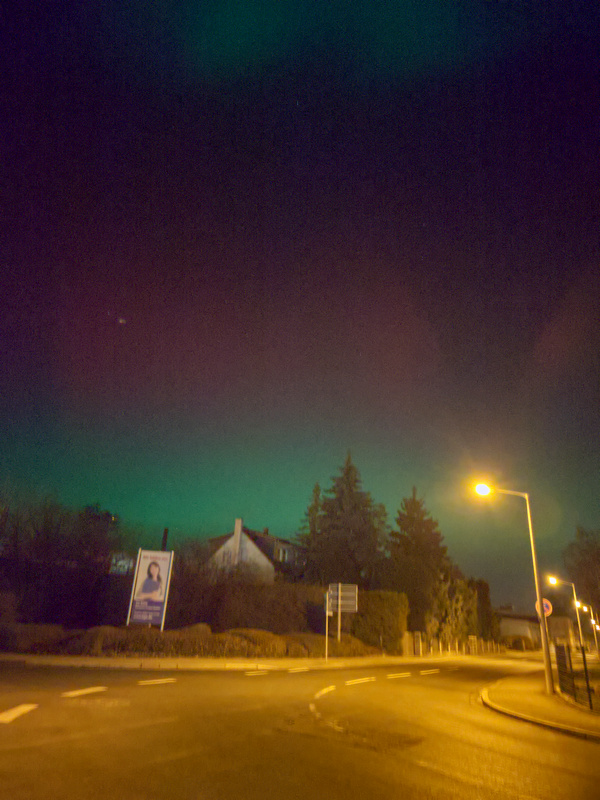 ich bin bisher stille Mitleserin und habe dank dieses Portals im Oktober 2024 meine ersten Polarlichter sehen können :D. Das tolle Event letzte Woche hat mich nun veranlasst mich zu registrieren. Hier folgen ein paar meiner Aufnahmen vom 19. Januar aus Göttingen. Ich bin kein Profi was das Erkennen von Polarlicht Phänomenen (RAGDA,...) angeht und benutze auch nur eine Handykamera (Samsung Galaxy A53). Ich konnte die Polarlichter von 21.45-23.30 Uhr beobachten. Es begann mit einem zunächst leicht rötlichem Himmel im Norden (visuell mit bloßem Auge sichtbar), wobei das Rot dann schnell intensiver wurde. Gegen 22 Uhr nahm die Intensität des Rots ab und wurde zunächst durch ein helles weißliches Glühen am Horizont abgelöst, das schnell in mintgrün überging. Ab 22.05 Uhr erstrahlte der Himmel in nördlicher Richtung kontinuierlich in einem intensiven Mintgrün. Ab 22.15 Uhr kamen sich bewegende, extrem helle, grüne Strahlen hinzu. Ebenso kamen grüne und rote blasenartige Strukturen hinzu. Sie tauchten schnell auf und waren teilweise ein paar Sekunden später wieder verschwunden. Ein roter Polarlichtbogen von West nach Ost war ebenfalls sichtbar. Dieses tolle Spektakel dauerte bis 23.10 Uhr intensiv an und nahm dann langsam ab. Um 23.30 Uhr war dann nur noch wenig zu sehen. Die Polarlichter waren hell, bis extrem hell. Die Bilder wurden nicht bearbeitet, nur für das Forum verkleinert.