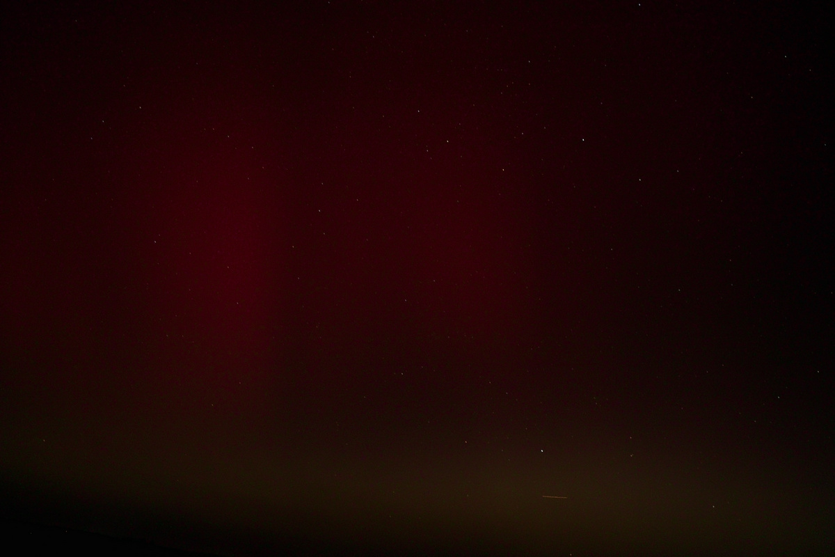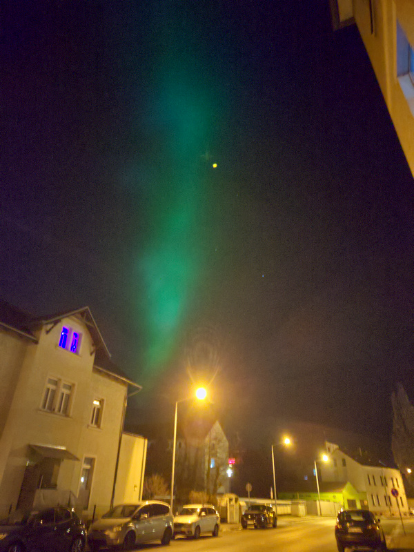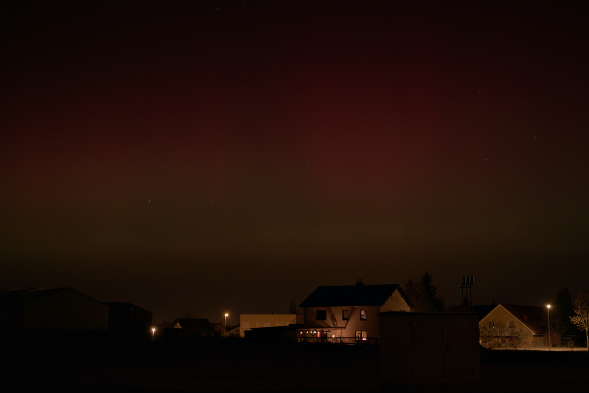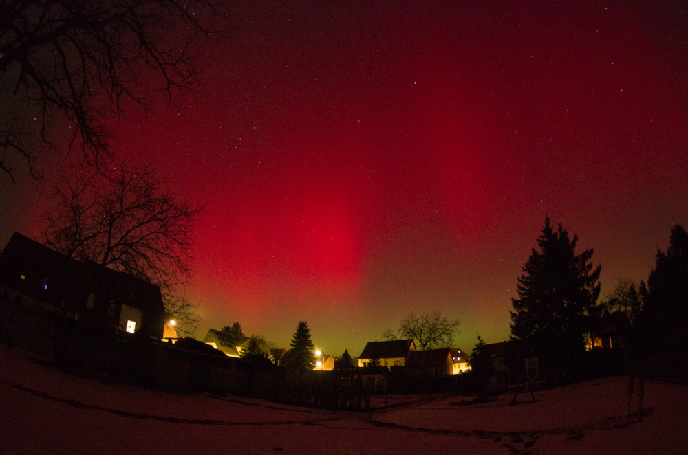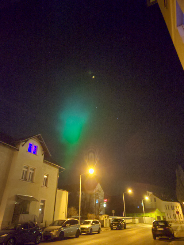 seit ca. 5 Minuten (20:30 UT) visuell dreckiger roter Bogen in gut 10 Grad Höhe - aus der Stadt/Stadtteil heraus. Mehr in NNW. Fotografisch schon einige Zeit länger.