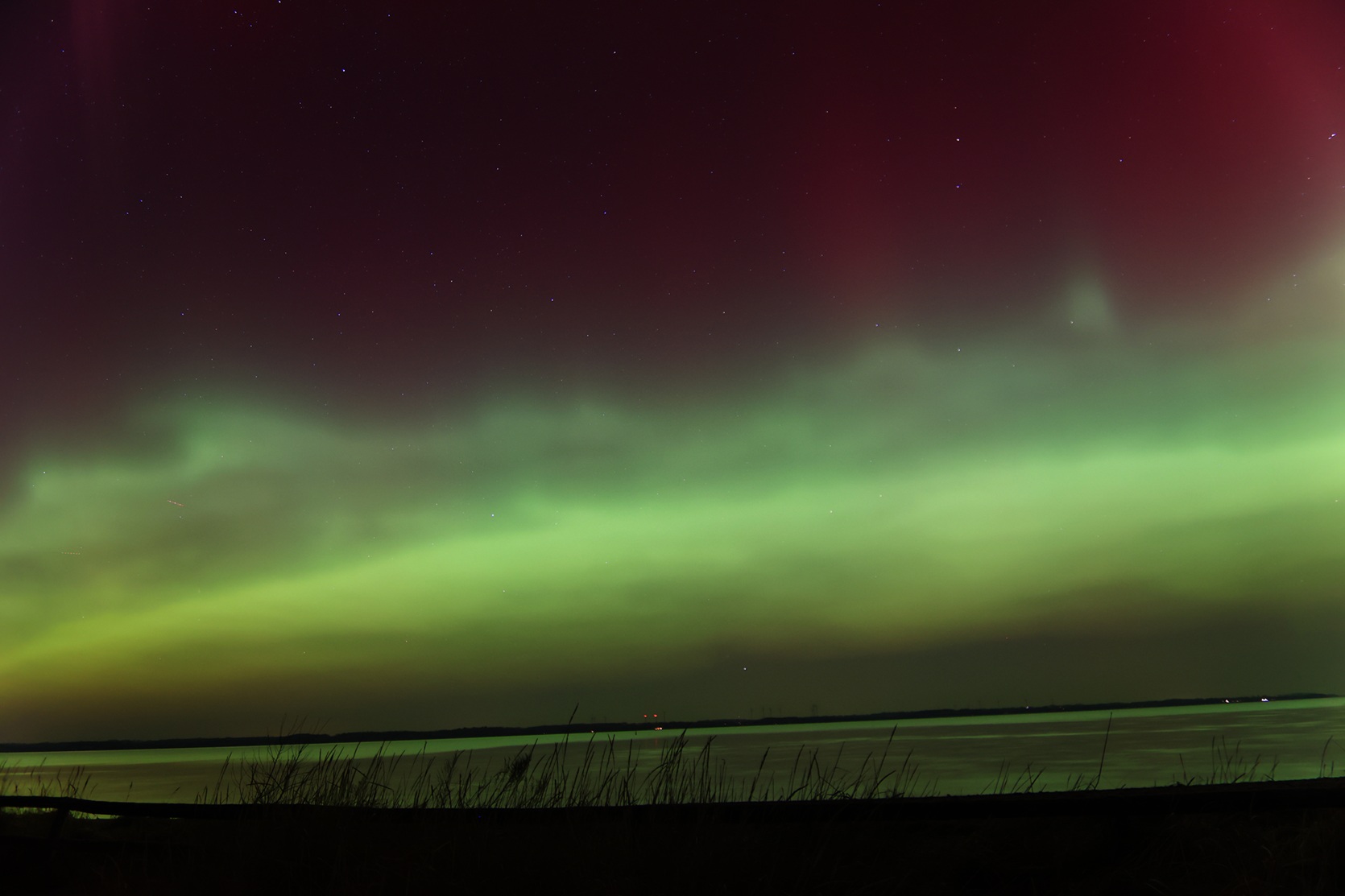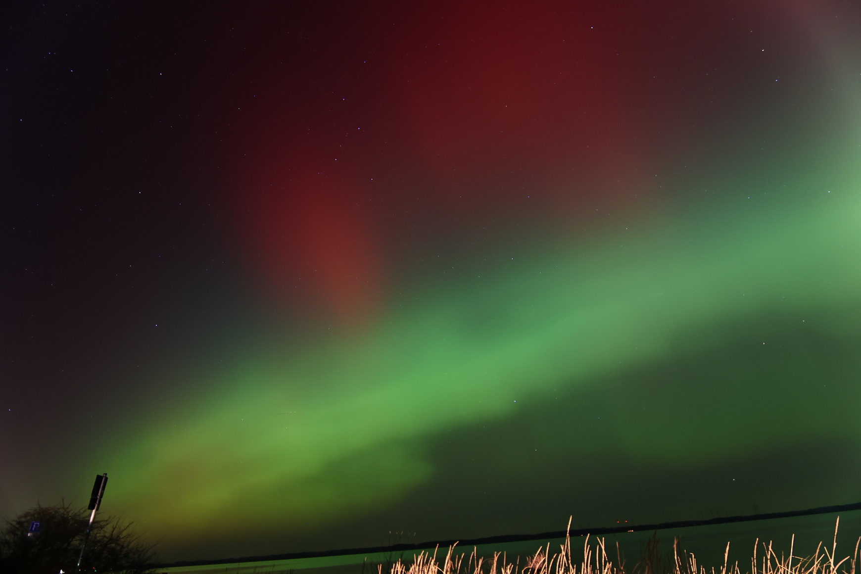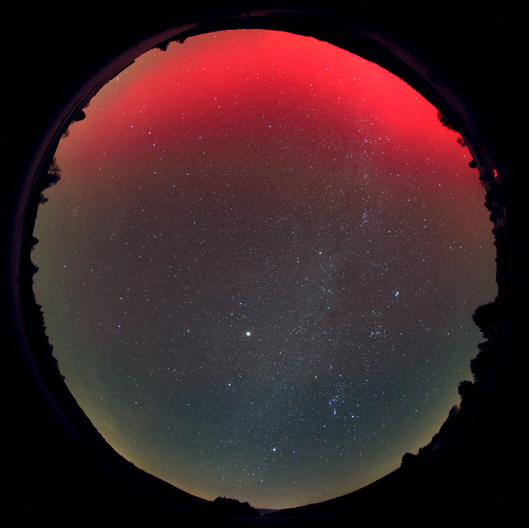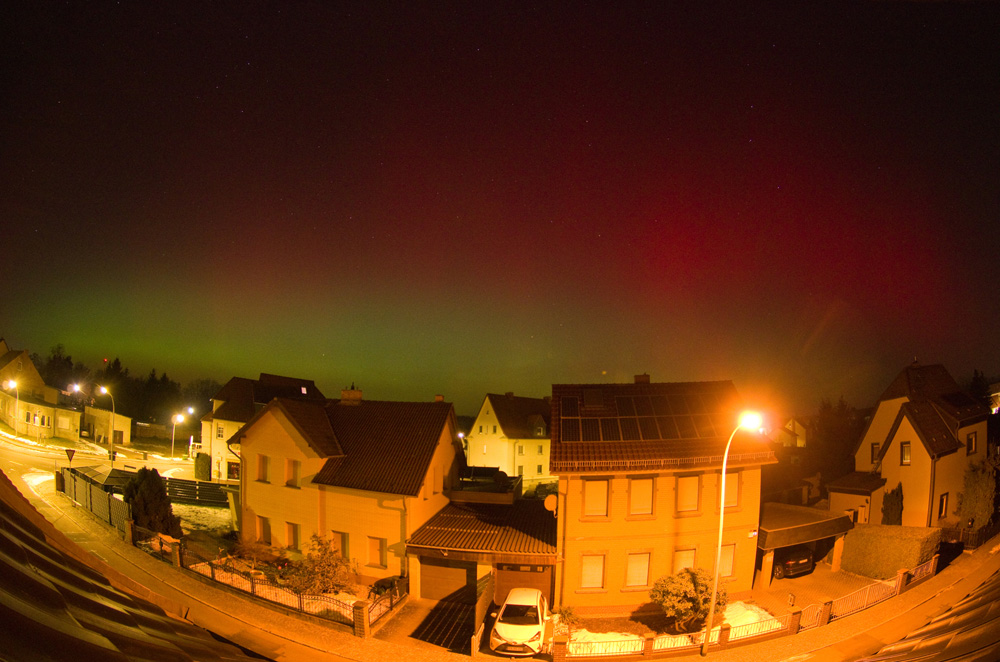 seit ca. 5 Minuten (20:30 UT) visuell dreckiger roter Bogen in gut 10 Grad Höhe - aus der Stadt/Stadtteil heraus. Mehr in NNW. Fotografisch schon einige Zeit länger.