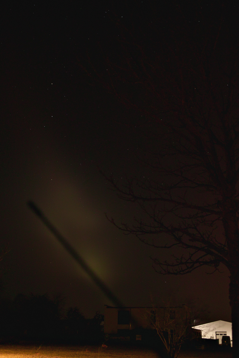 Kurze Sichtkontrollen zeigten die Aurora Borealis weit im Nordosten/Osten und im Westen bis zum Südwesten. Die oft berichteten hellgrünen Flecken/Wolken, die oft nur kurz wie pulsierend auftraten, habe ich verpasst.