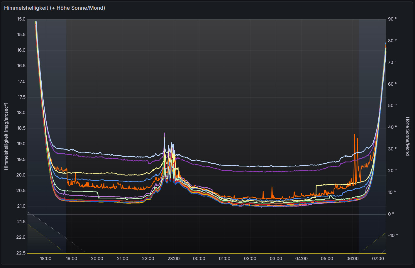und hier noch die Messungen der Himmelshelligkeit in der Nacht von verschiedenen Stationen in der Rhön (https://himmelsmonitoring.de)