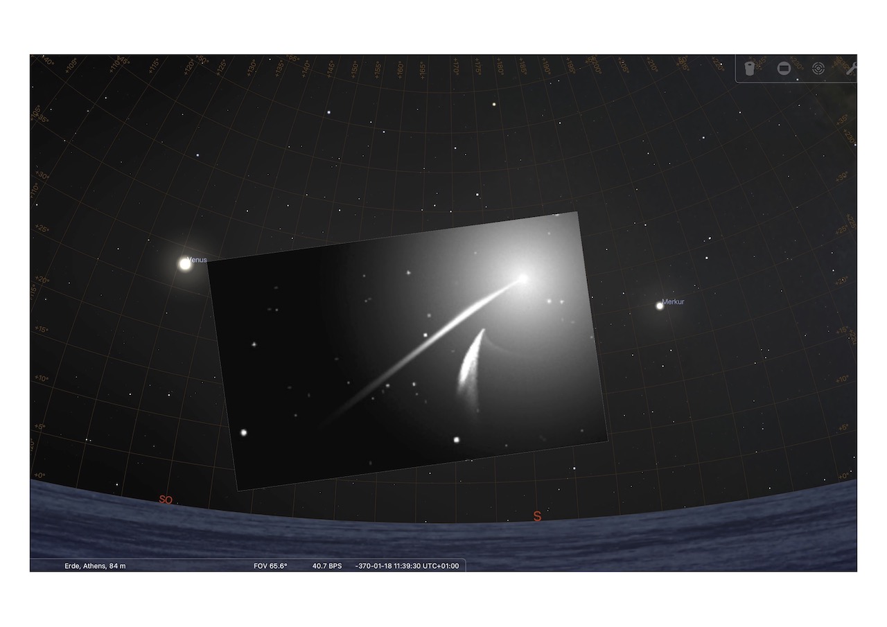 Nachtrag zum sog. aristotelischen Kometen (um 373 v.Chr.): Auch wenn es als sehr unwahrscheinlich gilt, dass dieser aufgrund des Zeitpunktes seines Erscheinens zu den Kreutz-Kometen gehört, zeigt die entsprechende Kreutz-Simulation von Lefaudeux (s. vorigen Beitrag, unter 3.) ebenso einen doppelten bzw. „gebrochenen“ Schweif. Nicolas Lefaudeux hat mir erlaubt, beigefügte Stellarium-Simulation mit einen screenshot aus seiner Simulation hier hereinzustellen. Die Montage zeigt die (unter den vorgegebenen Bedingungen simulierte!) Situation am Himmel von Athen am 18.01.371 v.Chr. um die Mittagszeit. Deutlich zu erkennen ist die Position des Kometen (und der Schweife) unterhalb der Sonne – zu diesem Zeitpunkt waren sie also nur am Taghimmel zu sehen. Die Flächenhelligkeit der Schweife hätte sie evtl. am Taghimmel sichtbar werden lassen. In dieser Simulation reichte die Helligkeit aus, dass der Komet noch venushell war, als er am Abendhimmel bei ausreichender Dunkelheit sichtbar wurde (am 27. Jan., ca. 30° unterhalb der Venus und ebenso weit von der Sonne entfernt). Gruß aus HD,
