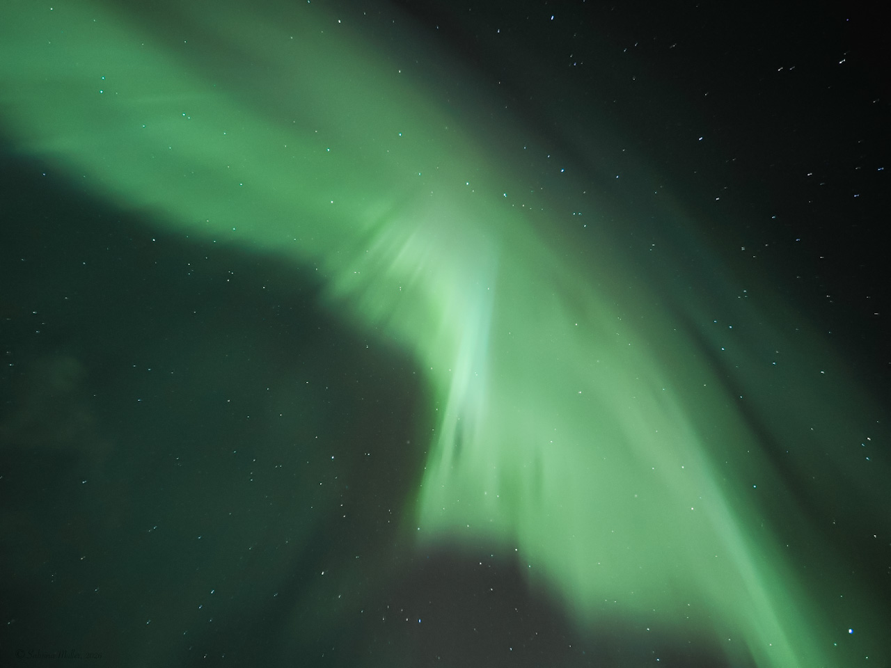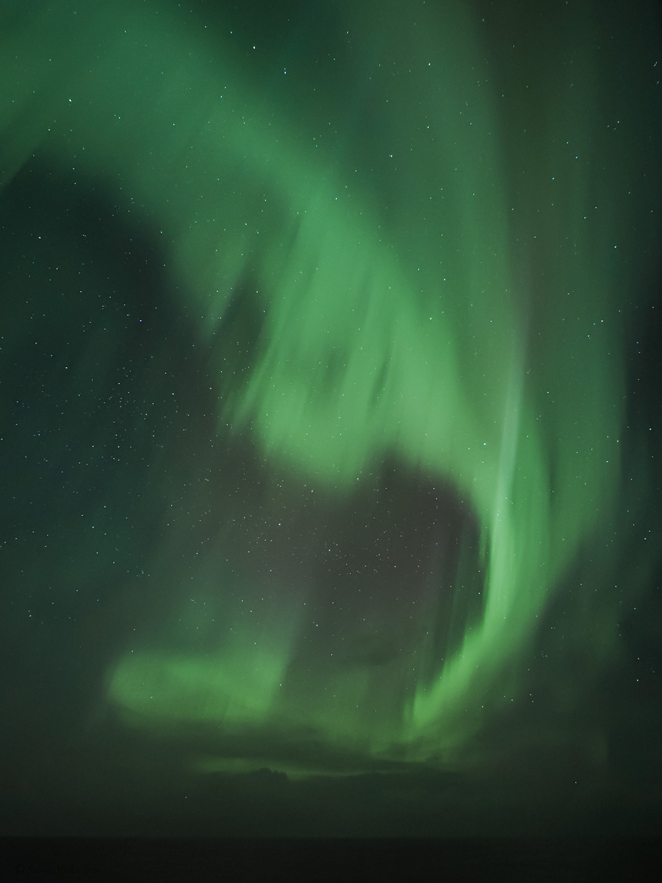 Ich bin dann erstmal ins Bett, aber war gegen 1:00 UTC wieder wach und war für gut eine Stunde draußen. In der Zeit war die Aktivität hoch, das Polarlicht teilweise extrem dynamisch, fast schon stroboskobartig. Visuell hell, Aber noch ohne Farbe. Alle Bilder freihand vom fahrenden Schiff (leider hell beleuchtet) bei teilweise ordentlich Wellengang fotografiert.