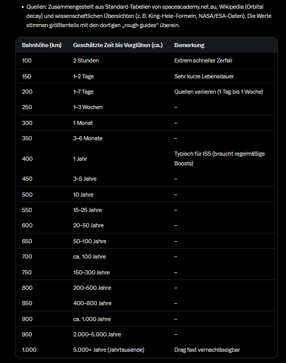 Verweildauer der Schrottteile bis zum Verglühen bei ca. 500km Bahnhöhe Jahre bis Jahrzehnte!