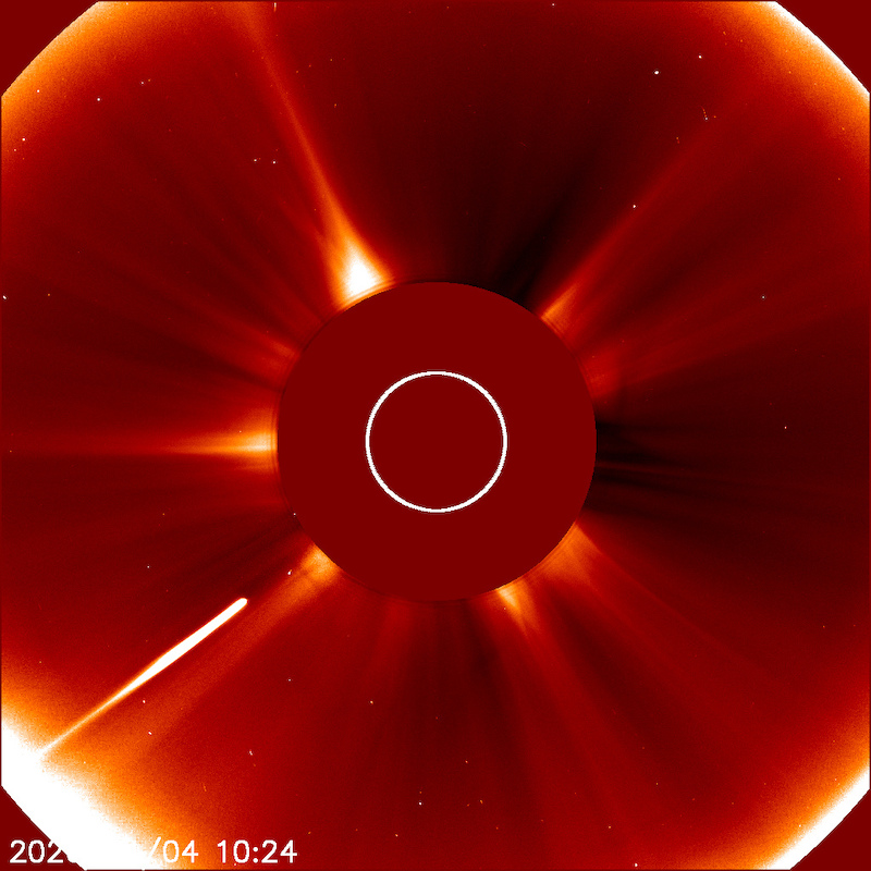 die potentiellen Winglets in den LASCO-Bildern, die auf ein Auseinanderbrechen des Kerns deuten können, waren mir gestern aufgefallen. Allerdings zeigte das besser auflösende CCOR-1 diese nicht, weshalb ich von Artefakten in den LASCO-Bildern ausgegangen bin. Was natürlich sein könnte ist, dass die Artefakte eine Folge einer Überbelichtung waren, und deren Fehlen in den Folgebildern indirekt auf ein Ableben des Kerns deuten könnten.