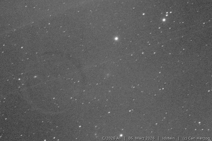 Zunächst einmal: C/2026 A1 konnte ich - anders als C/2025 R3 - nicht visuell beobachten. Und selbst fotografisch war es erst nach dem Stacken erkennbar. Hier einer meiner wenigen Positivergebnisse (in der Bildmitte):