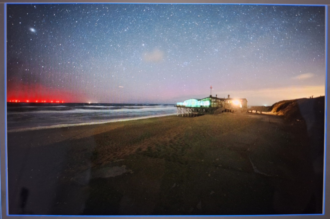 Nachdem die Gewitterfront durch war, zog der Himmel frei und rechtzeitig nach Mitternacht gegen 1:20 Uhr (10.4.26) war dann fotografisches Polarlicht möglich. (Links oberhalb der Strandbar)