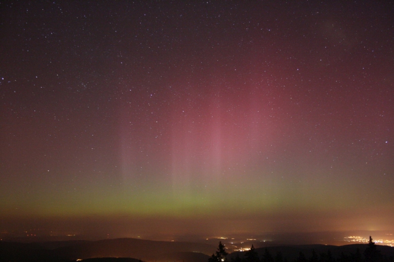 Von ca. 00:00 bis 00:20 fantastischer Strahlenvorhang! Bis ca. 35 Grad hoch. Deutlich visuell. Zeitweise intensives rot mit bloßem Auge sichtbar. Hat jetzt erheblich nachgelassen. Standort: Großer Feldberg bei Frankfurt/Main.