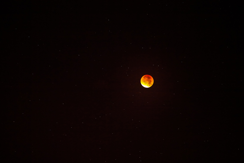 Eigentlich wollte ich die Mondfinsternis schön von einer Anhöhe mit darunterliegender, nebliger Landschaft aufnehmen. Aber selbst der erhöhte Standort (in der Region Hannover) lag im Nebel. Daher bin ich auf das Parkdeck eines Einkaufszentrums in der Stadt gefahren, von wo ich bessere Sicht hatte. Allerdings war der Mond zur Totalität bis auf einen kaum sichtbaren hellen Punkt im Nebel verschwunden. Zuvor konnte ich wenigstens ein paar Bilder festhalten. Ich zeige ich hier ein Bild, das ich aus zwei Aufnahmen zusammengesetzt habe (HDR). Ein Bild wurde passend für die Schattenseite belichtet und eins auf die beleuchtete Seite. Letzteres habe ich etwas hell gehalten, damit der Unterschied zwischen Licht- und Schattenseite nicht ganz so unnatürlich aussieht.