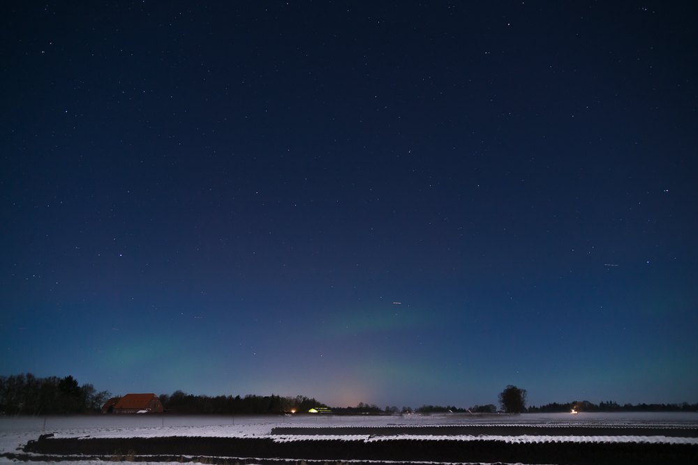 auch in der Wesermarsch gab's Polarlicht zu sehen. Leider konnte ich erst nach dem Maximum rausgehen. Bei aufziehendem Nebel und-5°C konnte ich zwischen 19:30 und 20:00 in 26939 Ovelgönne folgende Aufnahmen machen : ( 28mm, f2,8, ISO 1000, 5sec., leichte Anhebung Dynamik in LR)