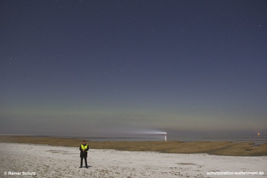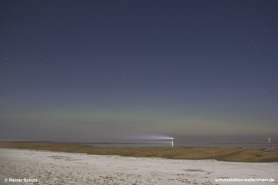 vielen Dank für die Meldung! In St. Peter-Ording kam ich kurz nach 19 Uhr nach draußen. Auf dem Weg mit dem Fahrrad zum Deich an die Tümlauer Bucht waren bis auf Höhe der Deichsel des Großen Wagens immer wieder helle Flecken zu sehen, die ich aber für vom Mondlicht erleuchtete Wolkenschleier hielt. Sonst hätte ich sofort in Nähe des Ortes schon das Stativ aufgebaut. Am Deich stellte sich dann bei den beiden ersten Fotos heraus, dass diese im Bild grünlichen Schimmer zum "oberen Bogen" des Polarlichts gehörten. Leider waren es in der Höhe die letzten. Danach war der untere Bogen in unterschiedlicher Stärke noch bis nach 22 Uhr zu sehen. Später war nicht mehr klar, was Polar- und was Mondlicht war.