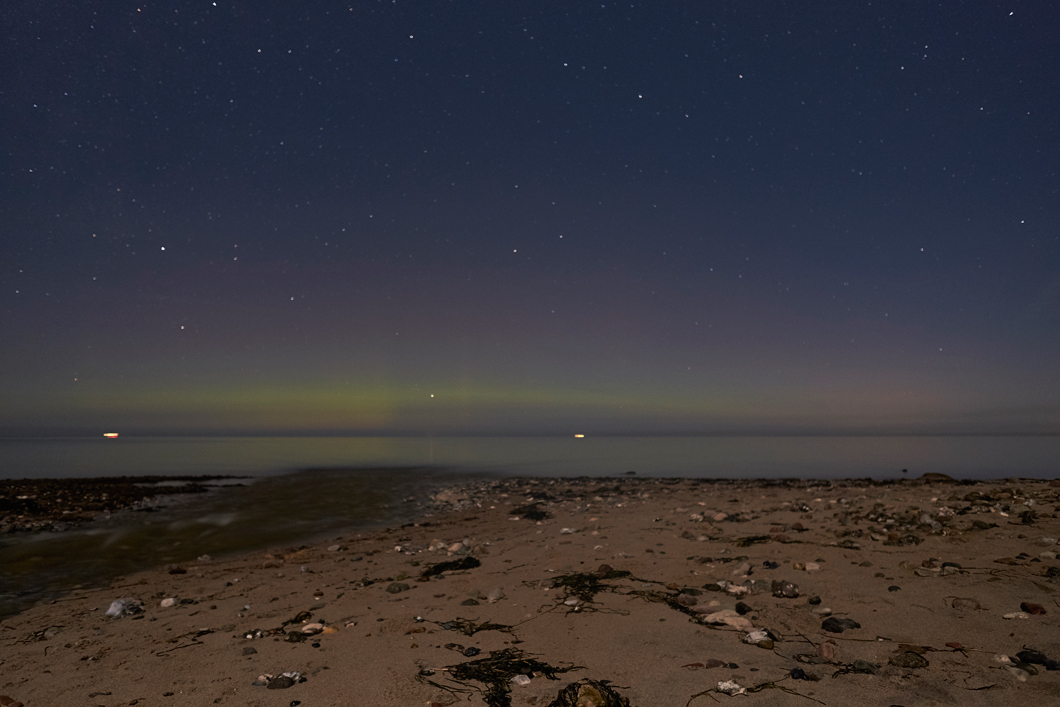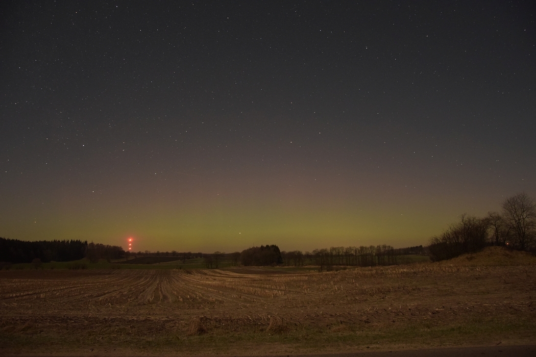 Zwischen 19 Uhr und 19:30 Uhr gab es hier außerhalb Kiels fotografisch ein kleines bisschen rot und grün, aber nur sehr diffus und schwach.