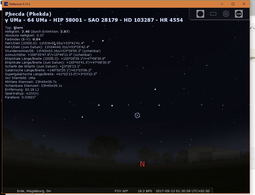 4. einfach einen Stern anklicken - in der ausführlichen Beschreibung findest Du auch Azimut und Höhe Außerdem kannst Du auch ein Koordinatennetz einblenden (Azimutal) - sehr hilfreiche Gitternetzlinien. Viel Erfolg!
