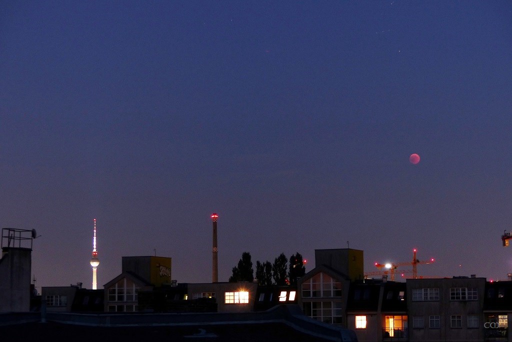 - vollen Zoom auf den Blutmond, wie er hinter dem Fernsehturm aufgeht...