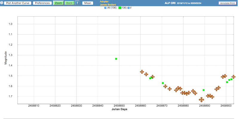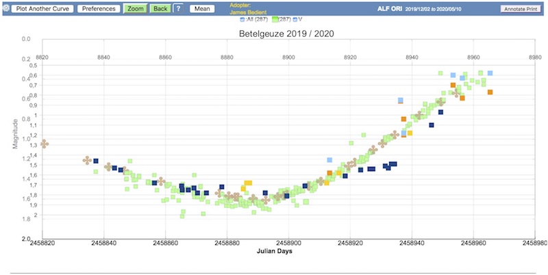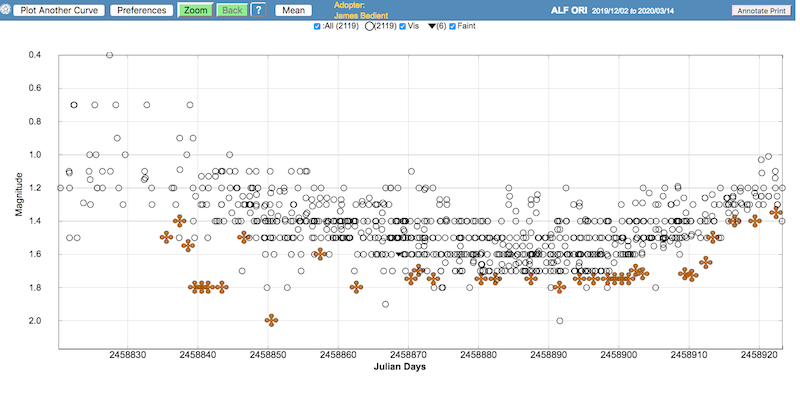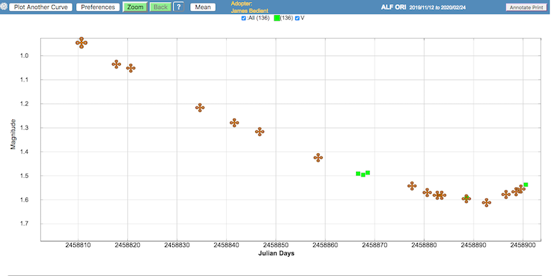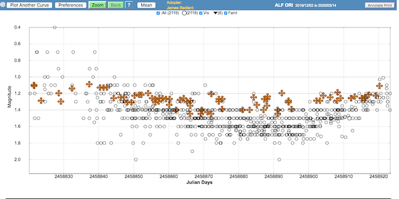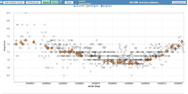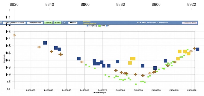 Mein nächstes anderes Projekt damit sind weitere Messungen vor und nach der Marsopposition, um den Phaseneffekt des Planeten zu bestimmen. Werde mein Konica-Minolta LS 150 aber beim Hellerwerden oder -sein von Alpha Ori mal einsetzen, wobei sich da aber das saisonale Zeitfenster bald schließen wird. Es war natürlich klasse, daß ein so spektakuläres Minimum von Beteigeuze in den (Nord-)Winter fiel.