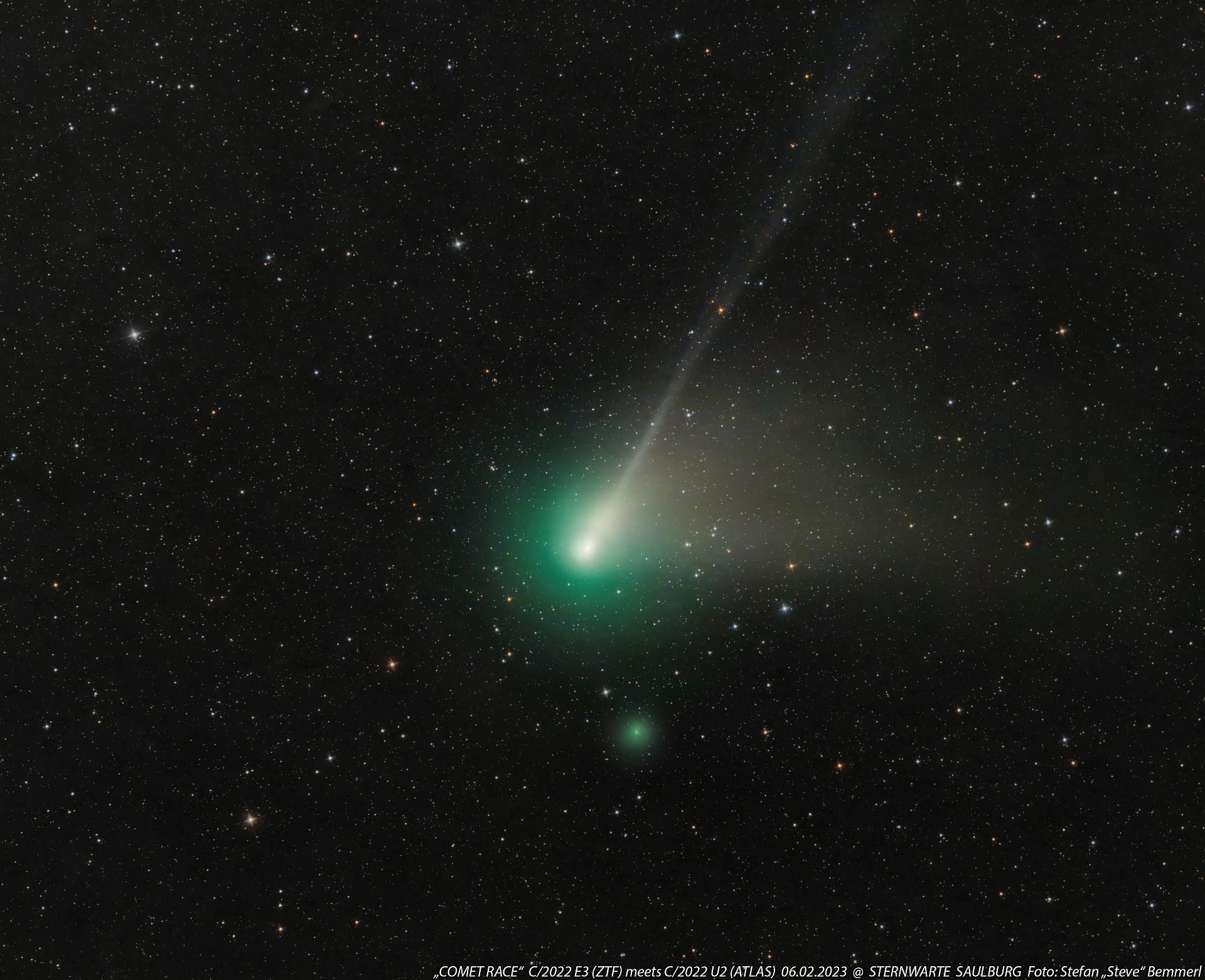 aber noch was anderes will ich euch doch zeigen: steve bemmerls bild vom 06. bei fast vollem mond, beide kometen. ich bewundere die bildbearbeitungskönner, die da alle register ziehen müssen, aber das ergebnis scheint mir reell.