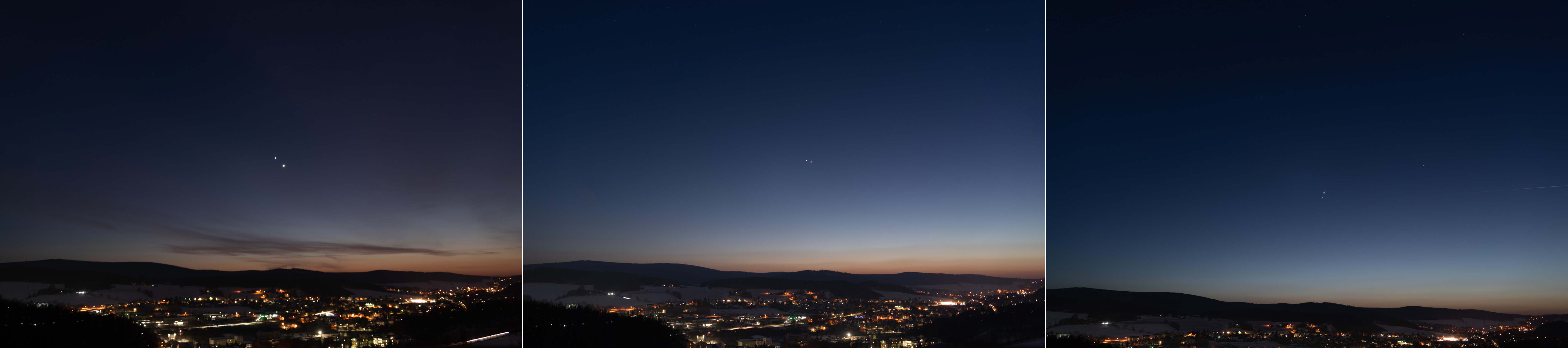Die Konjunktion entwickelte sich während dessen, bedingt durch den sinkenden Sonnenstand, zu einer auffälligen Erscheinung am Abendhimmel. Die sich dem Ende zuneigende nautische Dämmerung sorgte zudem für einen sphärischen Farbverlauf, in dessen tiefblauem Bereich die Konjunktion strahlte und das Sekundärlicht mittilerweile deutlich sichtbar wurde: