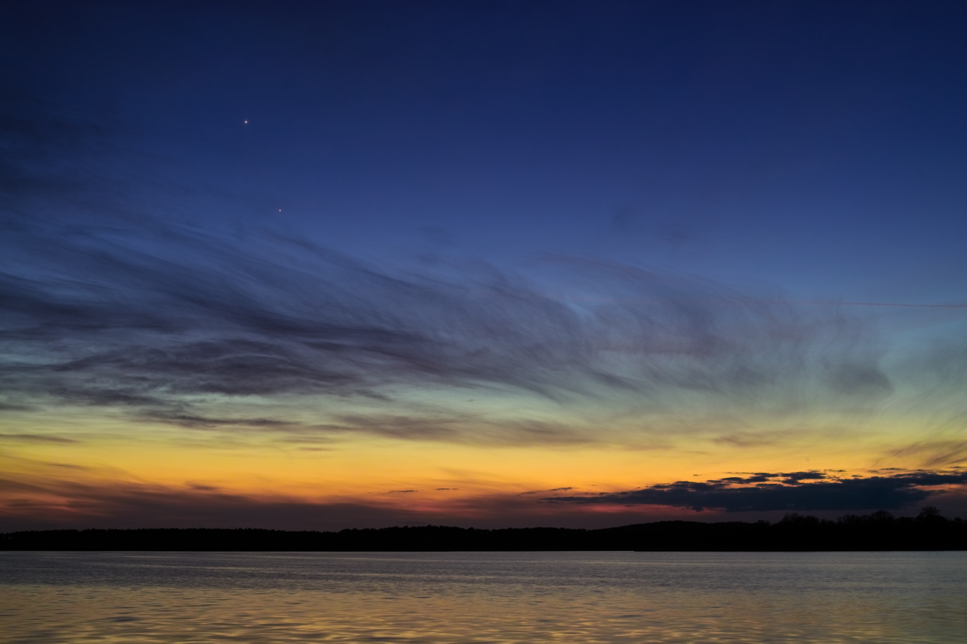 Mit der einsetzenden Nautischen Dämmerung leuchtete die Venus dann auf gewohnte Art und Weise am Westhorizont, im oberen Teil des Dämmerungsbogen, der unter Eindruck der Wetterlage aus glühendem Orange und leuchtendem Himmelsblau bestand. Ein wunderschönes Farbenspiel, noch ganz ohne Silberschleier.