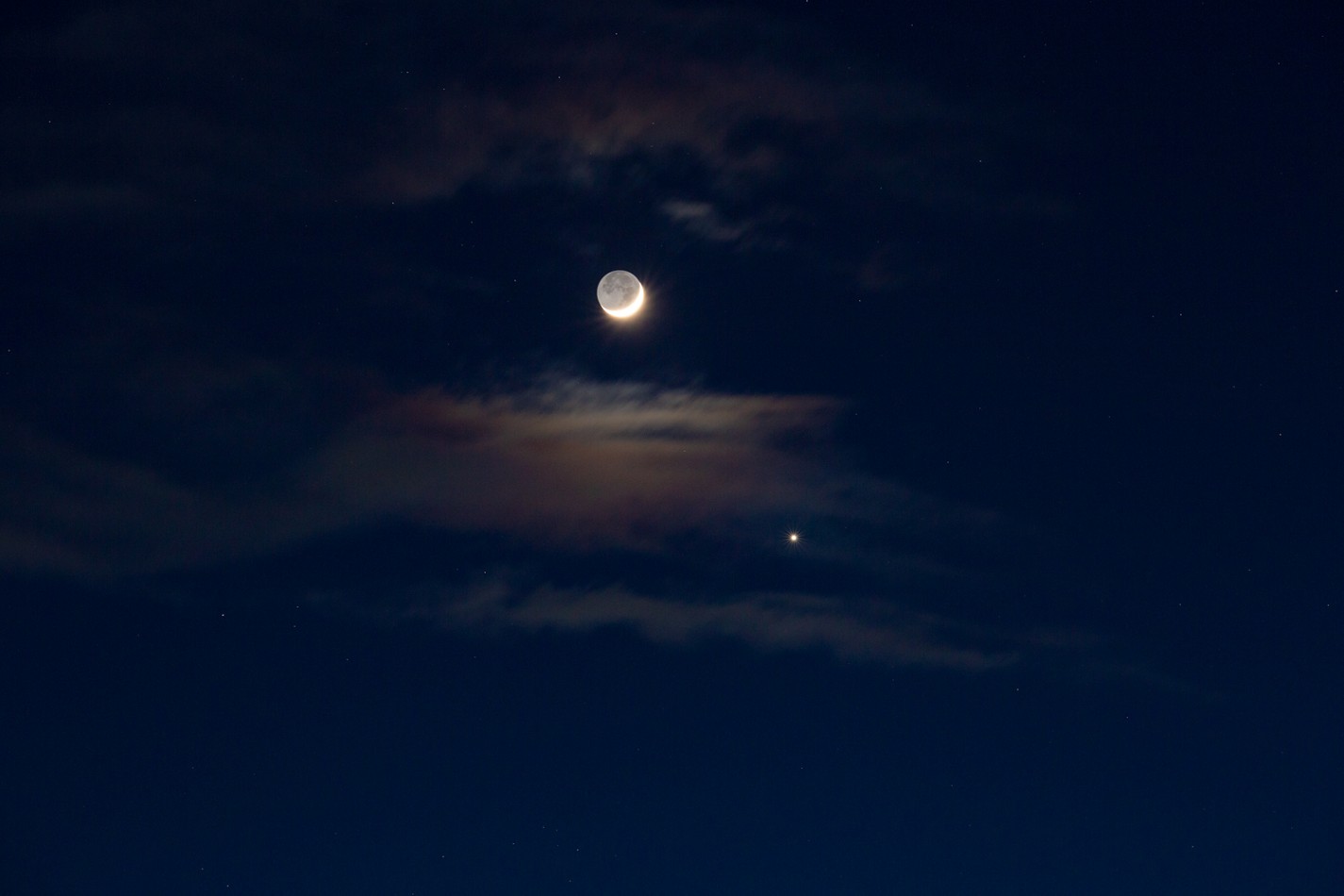 Wer die Venus im Frühjahr diesen Jahres verfolgt, kommt gewiss nicht an den Konjunktionen mit der Mondsichel vorbei. Seit Donnerstagabend (23.03.2023) gesellt sie sich erneut in nächste Nähe zur Venus und sorgt für bedächtige Momente. Wie so oft gilt, desto weniger Sichel, desto schöner - vor allem im Frühjahr, wenn sich das aschgraue Sekundärlicht von unserem Erdtrabanten abhebt und Schauerzellen die Atmosphäre durchpusten - um genau zu sein so, wie es gestern Abend der Fall war.