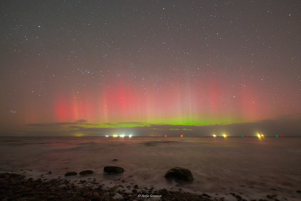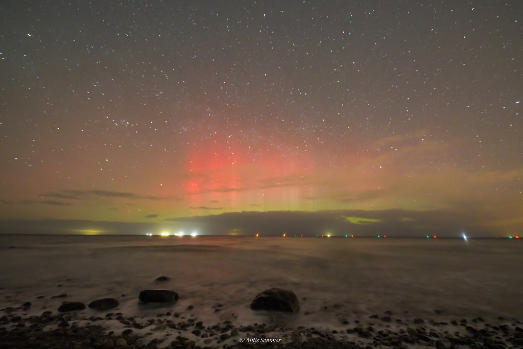 Kommentar: Zunächst schwach visuelles Glimmen am Nordhorizont, nach 22 UTC zügig emporsteigender und in Helligkeit zunehmender grüner Bogen (visuell farblos), ab ca. 22.30 UTC deutlich visuelle Strahlen, die anschließend in drei jeweils nur wenige Minuten andauernden Substürmen bis ca. 23:15 UTC bis etwa 25° Höhe (Sternbild Cassiopeia) deutlich visuell sichtbar waren. Fotografisch intensive Grün- und Rottöne. Nach 23:30 UTC sehr schnell abnehmende Aktivität.