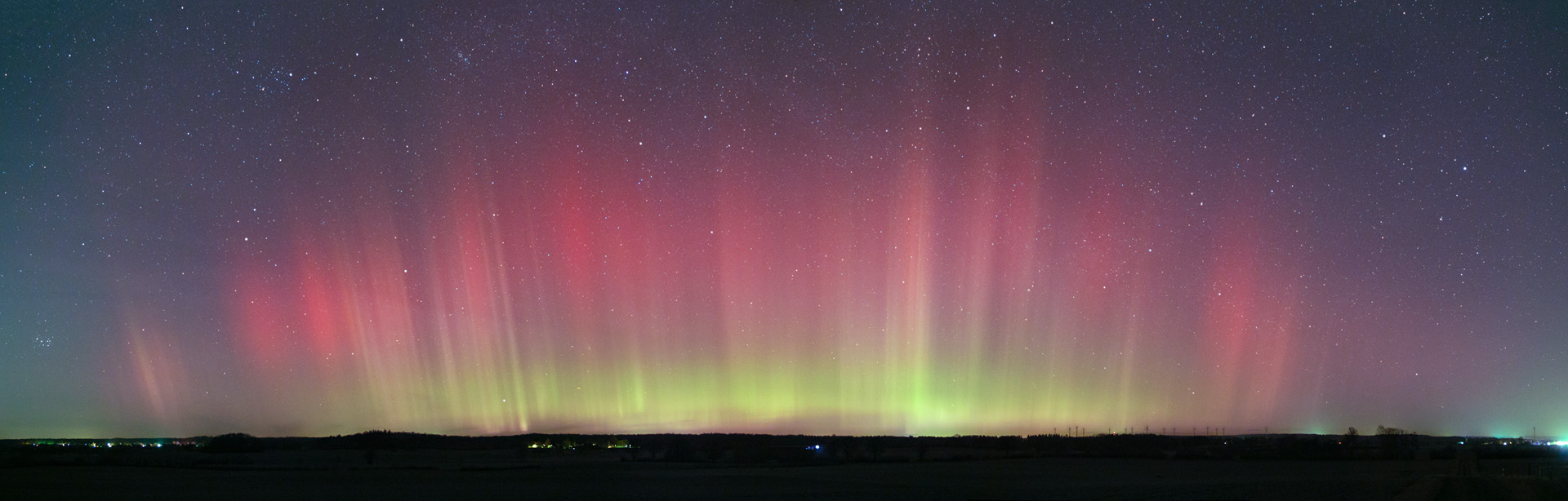 Kommentar: rotes diffuses Polarlicht schwach visuell; grüner gleichmäßiger Bogen später deutlich visuell, helle Strahlen deutlich visuell bis in eine Höhe von 25° - 30°