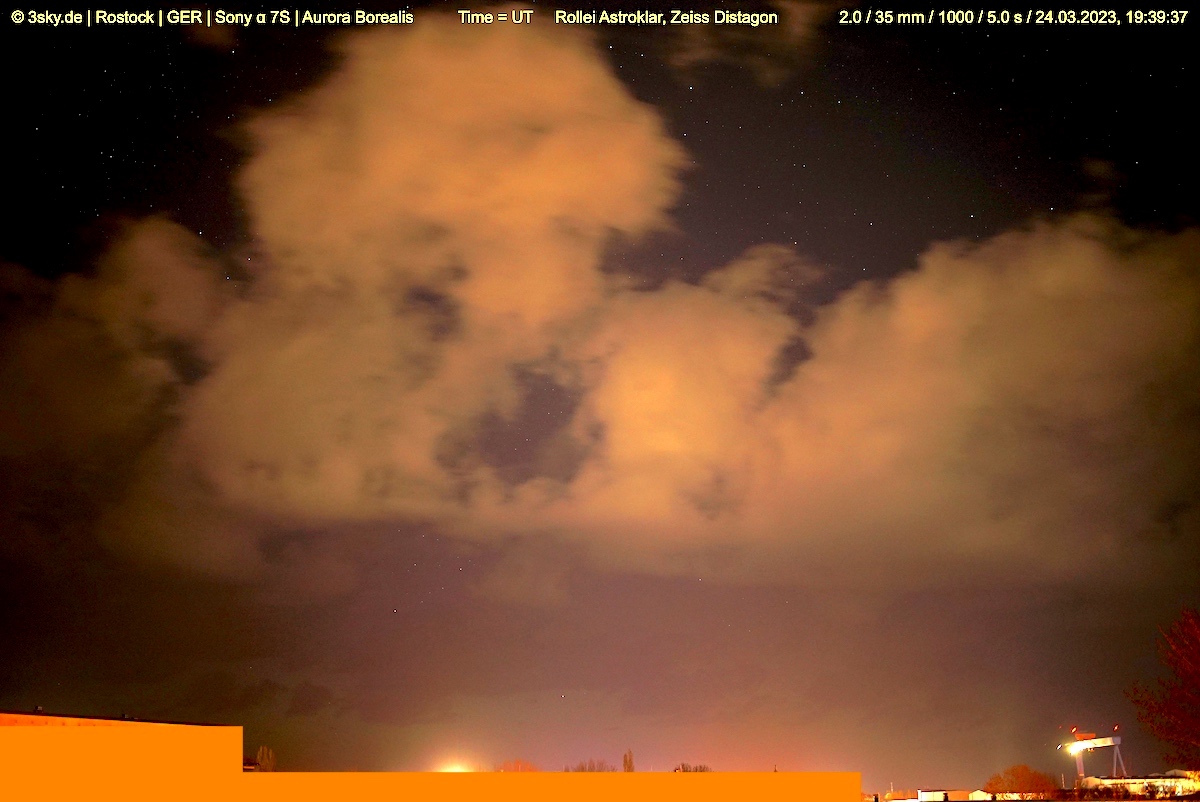 Ab Aufzeichnungsbeginn 19:38 UT PL grün, schwach, unter Wolken (Horizont), ggf. etwas rot (obwohl dies meist Lichtverschmutzung ist).