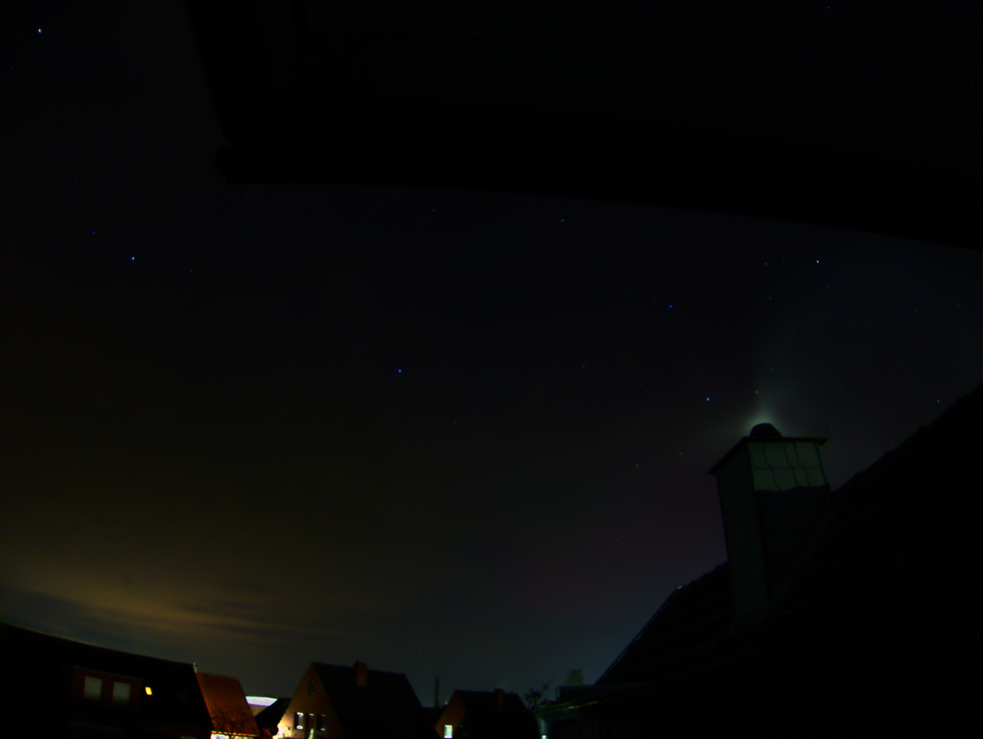 Hallo, ich glaube ich habe dieses mal auch trotz nur Kompaktkamera zumindest einen roten Schimmer eingefangen, links vom Schornstein. Was meint ihr? 23:23h in Schüttorf, Niedersachsen.