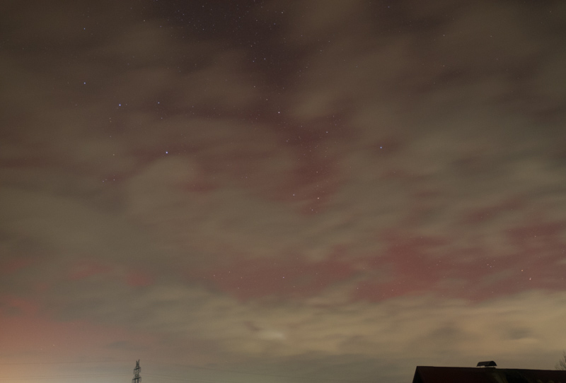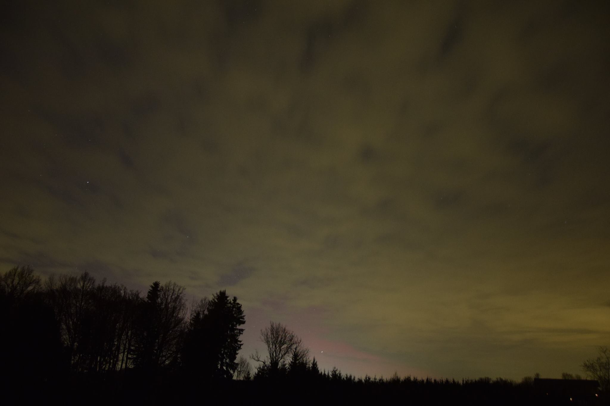 könnte das leicht sichtbare rosa Licht Polarlicht sein? Es war ca. 22:30 Ortszeit (Oberbayern nahe Chiemsee) und nicht mit bloßem Auge sichtbar und ließ sich nur auf zwei Bildern einfangen (ISO 800, 30sek, f 3,5) davor und danach war nichts mehr zu sehen.