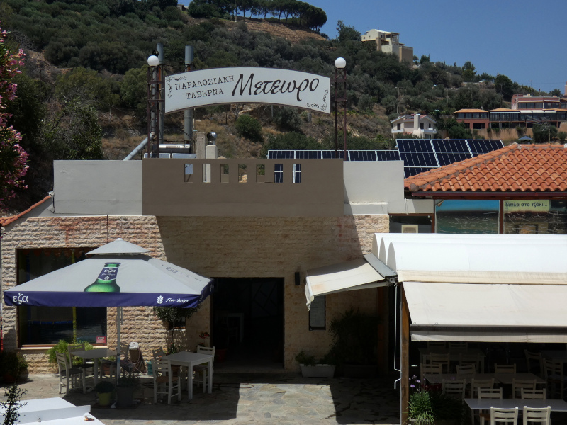 Am 9. Juli, Sonne dazu auch noch mit Fuß (Etruskische Vase): 13. Juli: Ganz schöner Apparat, leider nicht richtig scharf geworden Am 14. Juli kamen noch zwei neue Flecken dazu: Am 17. Juli zogen Rauchschleier vor der untergehenden Sonne vorbei. Die kamen nicht aus Rhodos, ich weiß nicht, ob es da schon dort brannte, sondern vom Golf von Korinth. Dort war auch ein großer Waldbrand, dessen Rauch westlich an Kreta vorbei nach Süden getrieben wurde und bei uns für einen Sonnenuntergang wie auf einem fremden Planeten sorgte: Am Abend des 21. Juli, dem letzten Urlaubsabend, war die Sonne dann sehr fleckig. Die muss wohl dringend mal geputzt werden: Zum Schluß noch ein anderes Bild. Dieser Taverne in der Nähe von Heraklion ist wohl irgendwie hinten ein "s" abhanden gekommen: Wer es nicht lesen kann: Der Laden heißt "Meteoro".