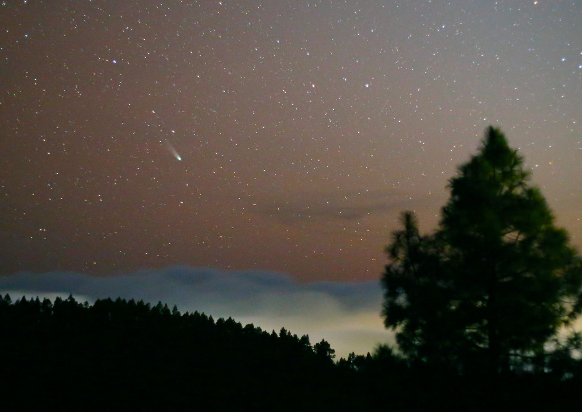 Anbei ein Bild von gestern Abend, 20:05 UTC mit dem Kometen noch 5,5° hoch über den Küstenwolken.