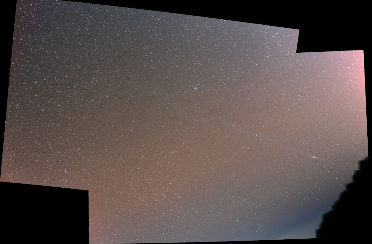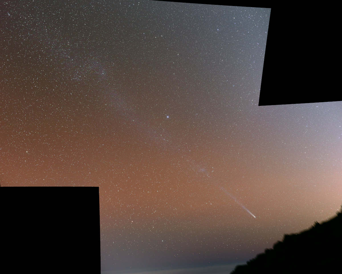 Schon am Kameradisplay fiel mir auf, dass der Schweif über das Gesichtfeld des 50mm Objektivs hinausging. Also habe ich ein Mosaik aus zwei Bildern gemacht: Der Schweif ist bis 36° zu verfolgen!