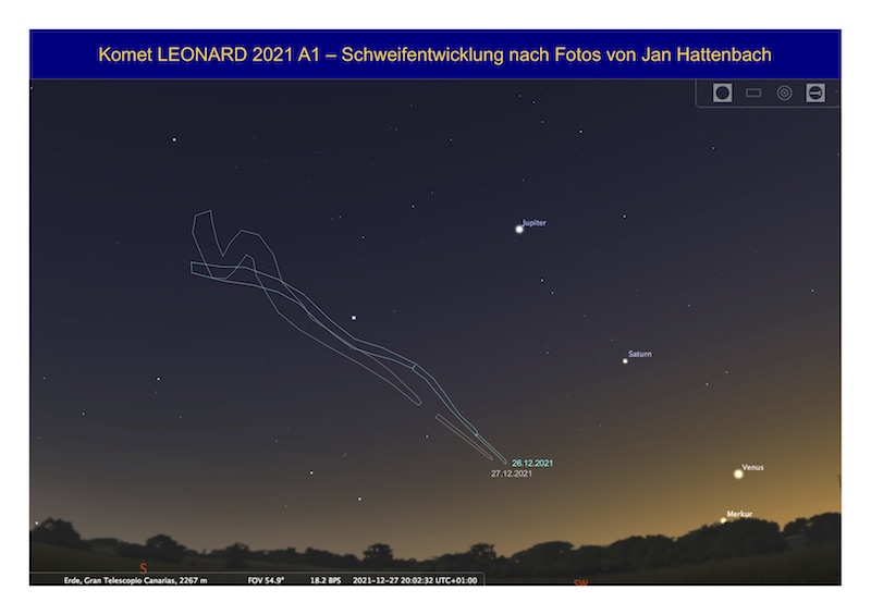 auf SpaceWeather ist heute (und auch auf APOD) der Komet Leonard mit einem Schweif von 60° Länge abgebildet (29.12.2021, 1h30m UT):