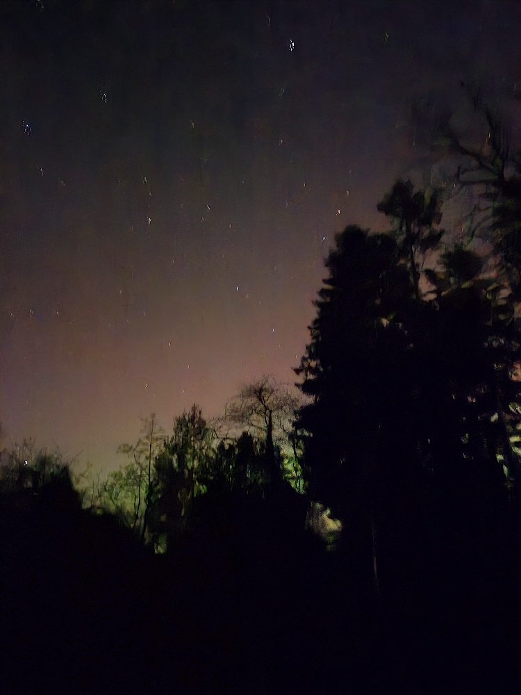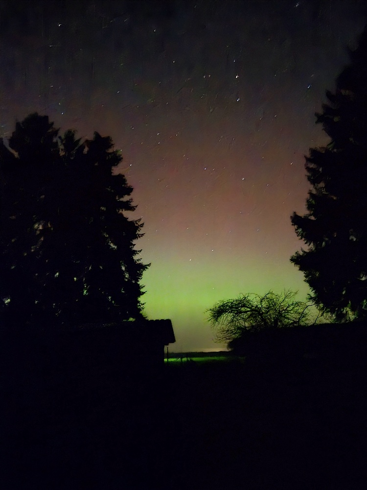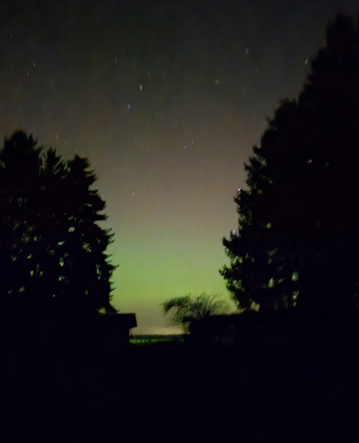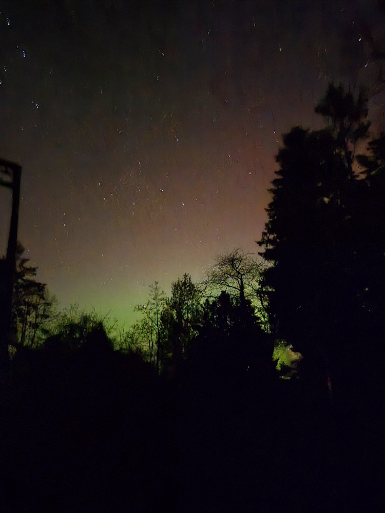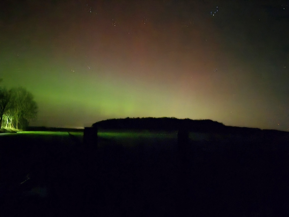 Es ging ja im Laufe des Abends noch weiter ... ich habe nochmal zwischen ca. 20:00 h und 00:50 h mit meinem Samsung Galaxy S24 fotografiert. Überwiegend war hier in Jeersdorf grünes Polarlicht zu sehen, dazu blasses rotes. Himmelsrichtung: von Nordwest bis Nordost. Freie Sicht ist immer NNO überm Jeersdorfer Holz.