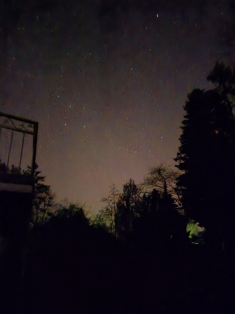 Auch in der zweiten Nacht nach dem X 1,9 Einschlag gab es Polarlichter zu sehen. Zwar nicht so spektakulär, aber immer noch hell genug, um Farben zu erkennen. Das erste Ereignis begann schon in der Dämmerung und erfuhr noch eine Zugabe gegen 23.30 Uhr. Ich habe bei den Fotos ein bisschen die Farbsättigung reduziert, was dem visuellen Eindruck näher kommt, als die schönen, schreibunten Bilder in den TV Nachrichten. Um ca. 2 Uhr habe ich die Beobachtung beendet. Da tat sich nicht mehr viel.